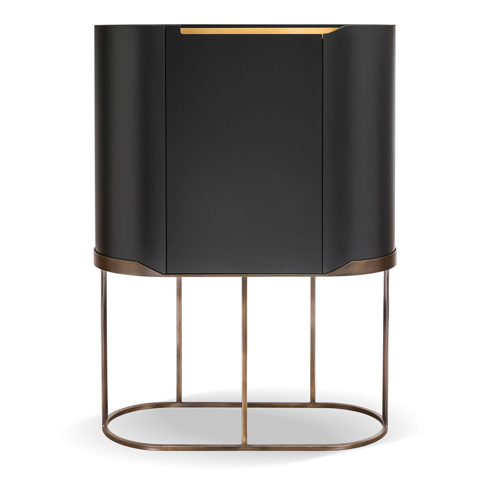 Strong curved design defines the exquisite wooden structure shown here finished in a matt black lacquered finish. A central door with hinge to the left, is shaped to create a versatile door opening and reveal a characteristic metal profile. Fitted with a soft-close mechanism for effortless closing. The interior is fitted with two adjustable shaped glass shelves with a polished edge. Wonderfully nestled on a contemporary laser-cut steel base with a feature perimeter band in a bronze patina finish. Weight 110 kg. Creating a fabulous focus. Available with alternative finishes and tops in lacquered wood, stone or marble. There is also the option to have the cabinet modified by request ready for the fitting of internal lighting. Prices will vary. Lighting not included.