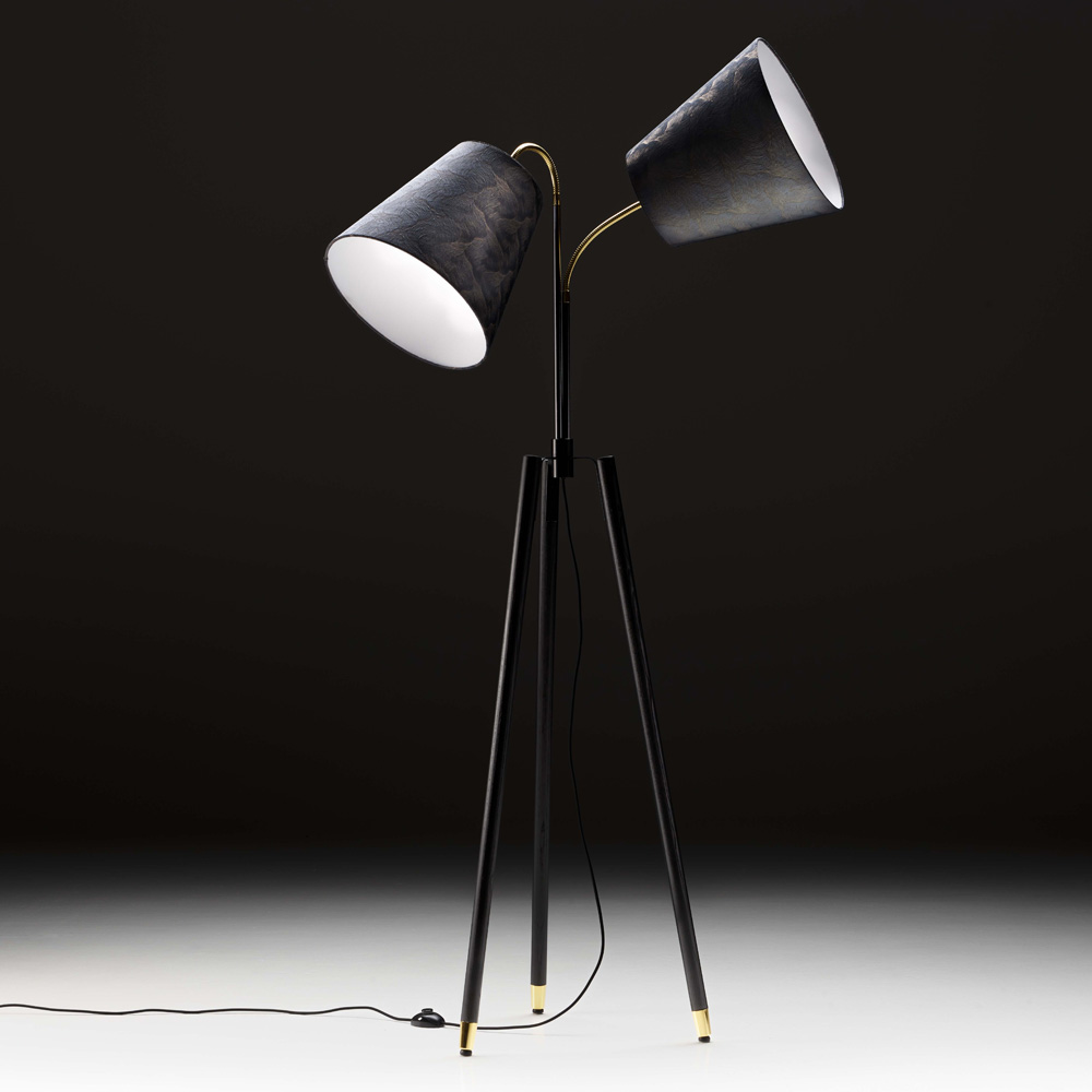 Balanced by design, a solid ash wood tripod structure with matt black painted metal details gives a sense of lightness. Cradled by defining metal detailing in polished gold finishes. Two adjustable lampshades offering diffused light, are decorated with rich textured fabric of Japanese inspiration and complete it, making it the star of the show. Requires 2 x E27 bulbs, LED bulbs suggested – not included. Plug type F (EU- schuko) with adapter type A (USA) or type G (UK). CE certified.