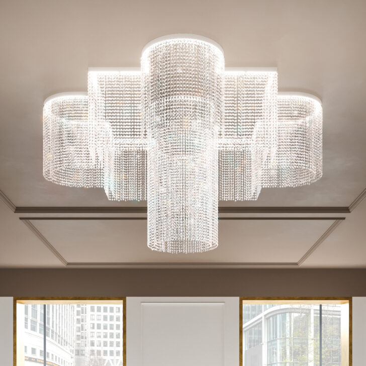Elevating any space with sophistication. Its frame in an embossed white finish is adorned with dazzling transparent crystals, in either half cut glass or cut crystal. Radiating a warm and inviting glow. Outer elements have a height of 50 cm and the inner element is height 100 cm. Weight 80 kg. Standard integrated LED lighting – 93,6 W CRI>95 – 3000 K – 12051 NOMINAL LM. Compatible with a 1-10V dimming control system. Driver recessed. Available in custom sizes by request – prices will vary.