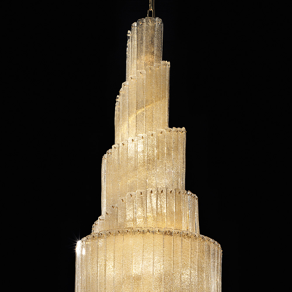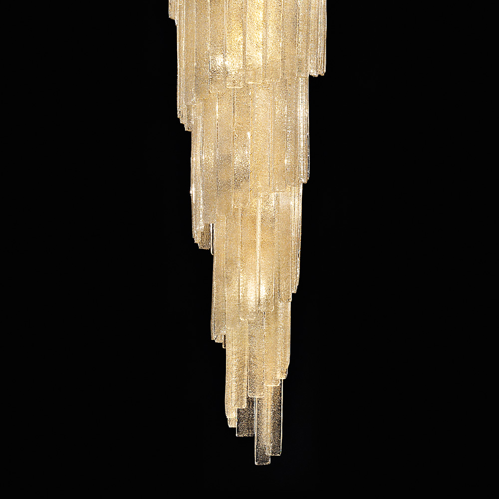A painted metal frame supports spiralling tiers of elegant strips of hand made amber cast glass, in a graniglia or grit finish. A process where a fine grit is mixed with the glass while it is still molten to create a finely-textured surface. Available in 4 sizes as standard. Height 230 cm x diameter 50 cm, weight 105 kg – which requires 1 x E14 10 W max and 19 x E27 x 20 W max bulbs. Height 360 cm x diameter 80 cm, weight 240 kg – which requires 30 x E27 20 W max bulbs. Height 450 cm x diameter 100 cm, weight 360 kg – which requires 40 x E27 x20 W max bulbs. And height 500 cm x diameter 120 cm, weight 580 kg – which requires 52 x E27 x 20 W max bulbs. Bulbs are not included. Hanging chain 100 cm as standard, can be altered at installation stage. Part of a fabulous collection, wall light and tiered chandelier also available.