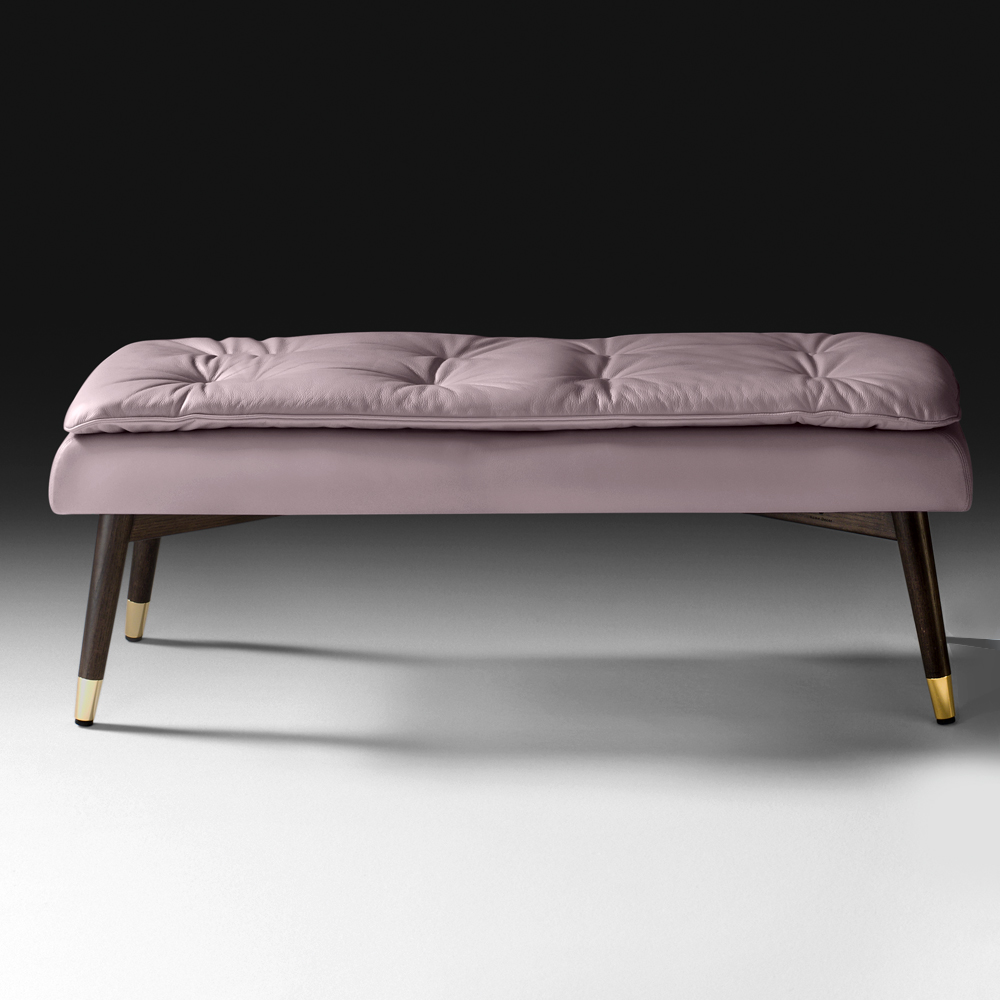 The Leather Button Upholstered Bench is pure elegance, every inch a statement of outstanding style and design. Timeless glamour. To suit both a classic or contemporary interior, the perfect addition in any setting. Perfect those who have an eye on the classics but also in contrast enjoy the comforts of modern living. A touch of sophistication and opulence which creates the most striking outline. The perfect use of materials as shown, a harmony of forms. Upholstered to the highest standard in the finest soft leather with an additional fixed button upholstered padded seat cushion. Creating a sumptuous effect. On solid lacquered mocha Ash wooden legs, completed with the most refined metal glides in a polished gold finish. A solid beech wooden structure. Padded in foam together with memory foam in various different densities for the ultimate in luxurious comfort too, please note that covers are not removable.