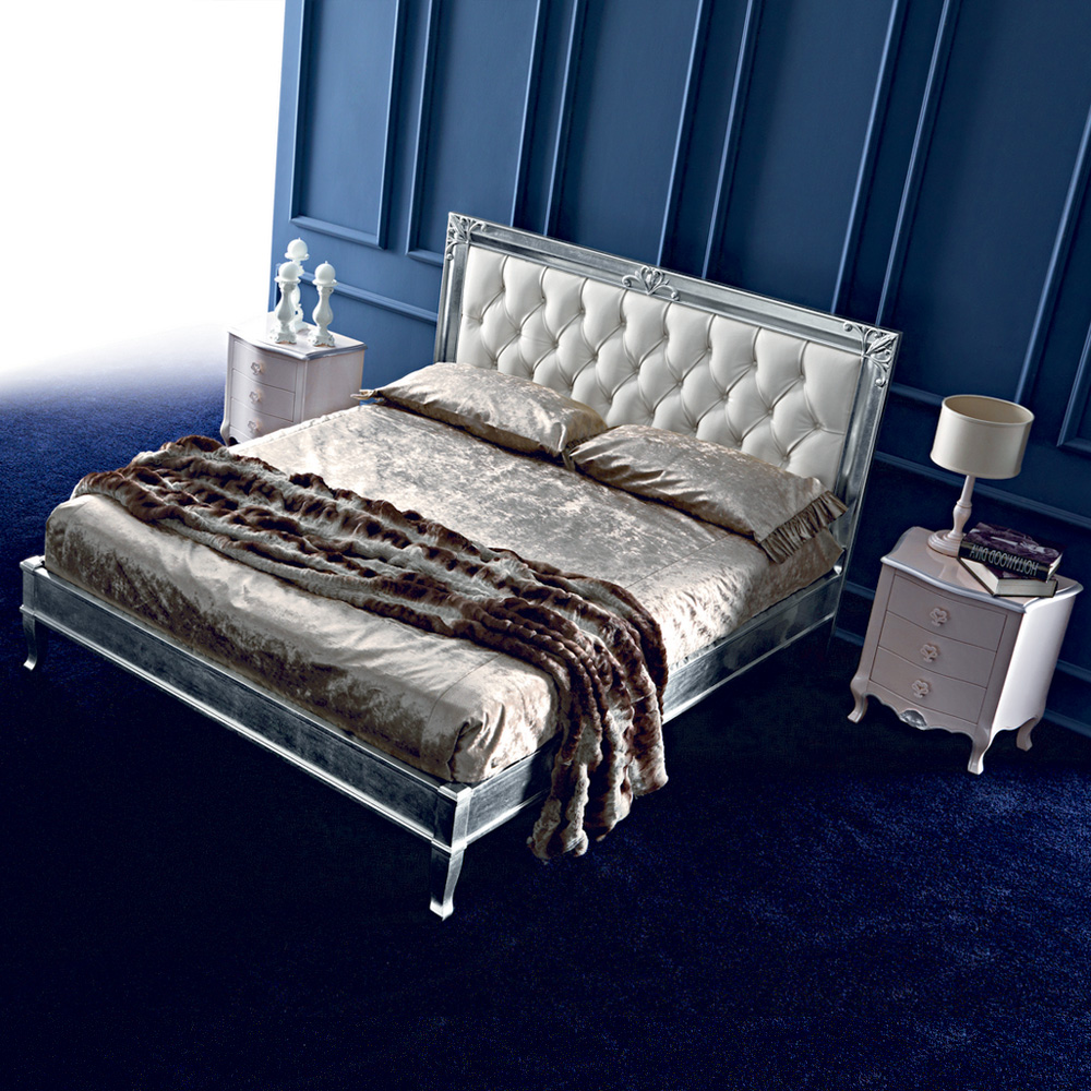 The Leather Button Upholstered Silver Leaf Bed. This seductive bed uses sumptuous finishes and textures to make a luxurious statement. This unique design features a fabulous silver leaf finished frame and a soft white Italian leather button upholstered headboard. The headboard is available finished in a variety of fabrics, including customers own.