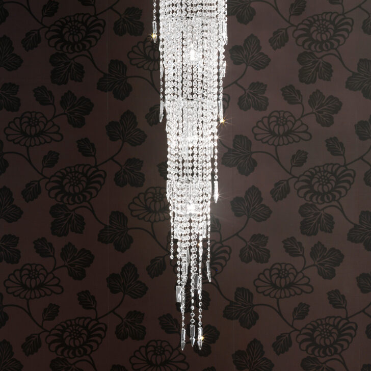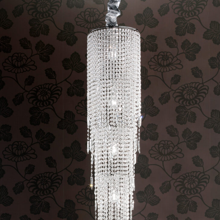 The Long Tiered Crystal Italian Chandelier is mesmerising. Truly beautiful, use this gorgeous modern chandelier in a long vertical space for the best focus. Simply perfect as stairwell lighting.