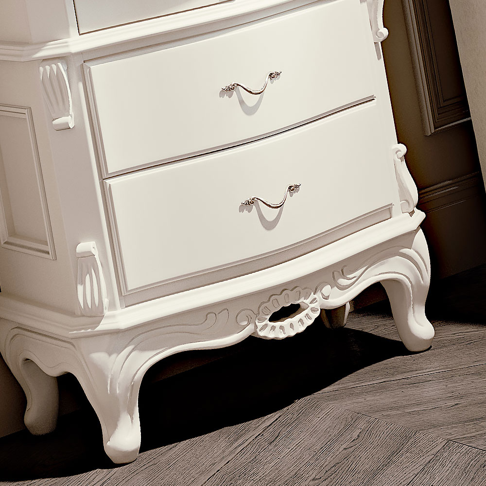 This luxurious bedside table is made from solid beach wood in a white antiqued finish. Featuring 3 drawers, providing the perfect storage solution. Beautiful handles, intricate carved detailing and elegantly carved legs complete this stunning design. Height 71 cm x Width 62 cm x D 41 cm. Available in a variety of alternate sizes, colours and finishes. Prices will vary.