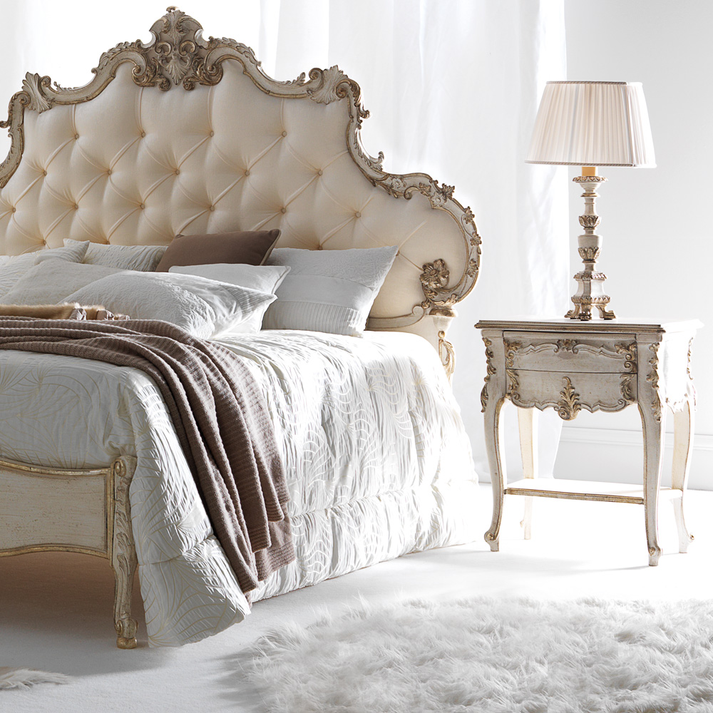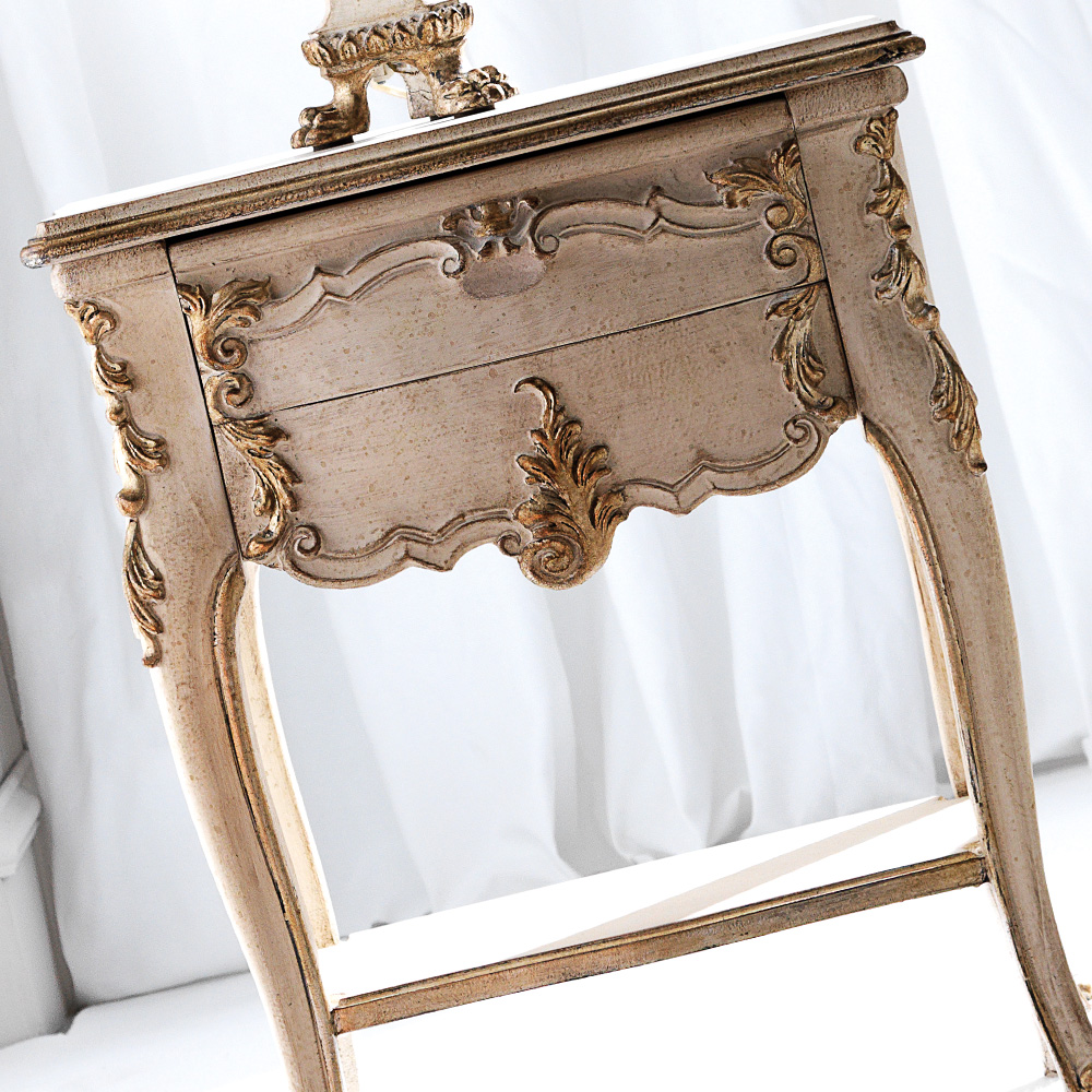 The Louis Reproduction Italian Bedside Table, with two concealed drawers and lower shelf. A beautiful addition to any bedroom, but also as perfect as a side table by a sofa or in a hallway. Truly versatile. Shown here in an antiqued ivory finish, together with beautiful antiqued hand painted accents of gold to the ornate carved detailing. Alternative frame colours and finishes also available. This bedside table is shown here as part of a bedroom set, also pictured. Made to highest standards. Allow 12 weeks production, plus delivery. The subtle finishes of the unique Florence Collection with every detail designed to be exclusive.