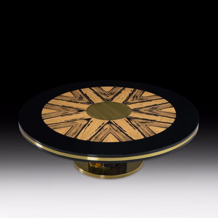 Hand-crafted with remarkable attention to detail by master craftsmen. An exquisite combination of royal ebony veneer and black lacquered wood, finished in high gloss varnish. Completed by polished brass detailing. Designed in a minimal contemporary style making its beautiful radial arrangement to the top and triple pedestal detailing its defining aspect. Creating a fabulous focus. Height 38 cm x diameter 120 cm. Available to order in various sizes and finishes by request. Prices will vary.