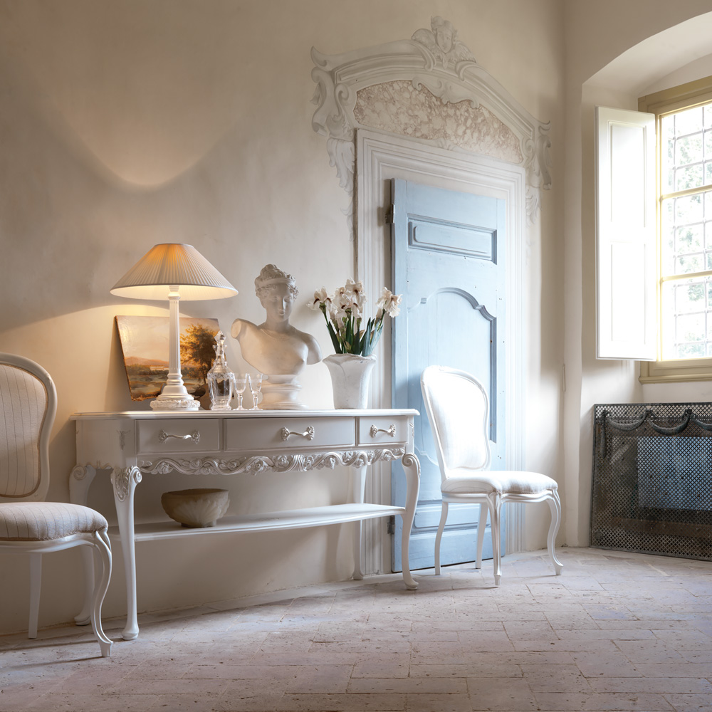 The Luxurious Carved Italian Console Table is a statement of style and glamour for any room in the house. A touch of classic beauty for any setting. A beautiful welcome in a hallway but just as perfect as a dressing table, truly versatile. Enhanced with beautiful rose handle detail, shown here in an antique white with hand painted bleached silver elaborate detailing and a wooden top. Also available to order in different colours and finishes or a marble top. Height 84 cm x width 154 cm x depth 54 cm.
