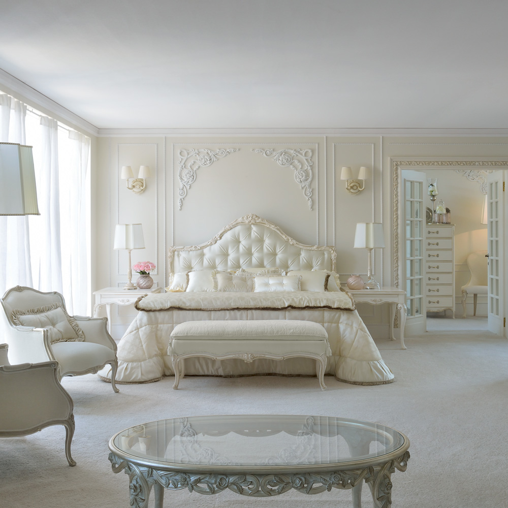 The Luxurious Classic Italian Designer Button Upholstered Bed. Shown here in a luxurious antique white and silver painted frame and button upholstered with a high quality off white satin. Size shown to fit mattress 200 cm x 200 cm, overall size height 157 cm x width 208 cm x depth 208 cm. Other sizes are available to order with alternative fabrics and leather, including customers own fabric, frame colours and finishes and also as a headboard only. Prices will vary.