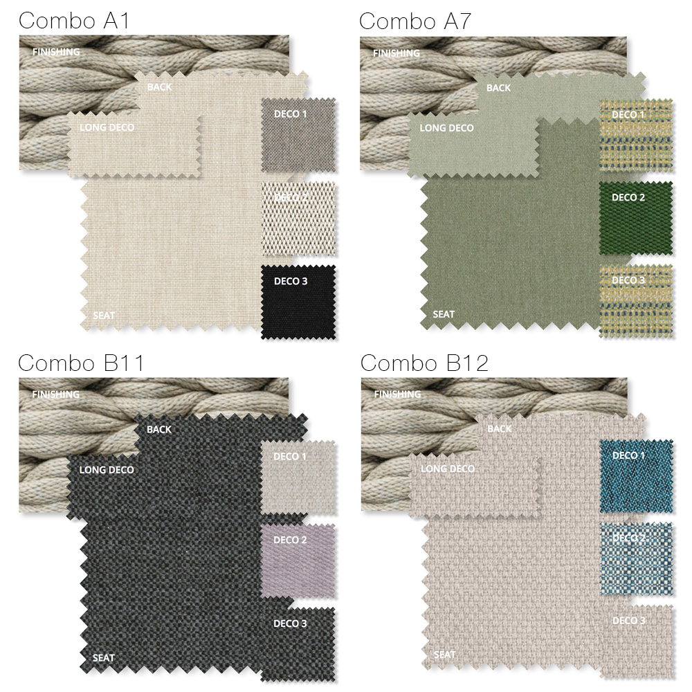 Cushions are included and comprise of a seat cushion, a back cushion, and a deco cushion measuring 40 cm x 40 cm. Various combinations are available, as shown. Protective cover also available by request.