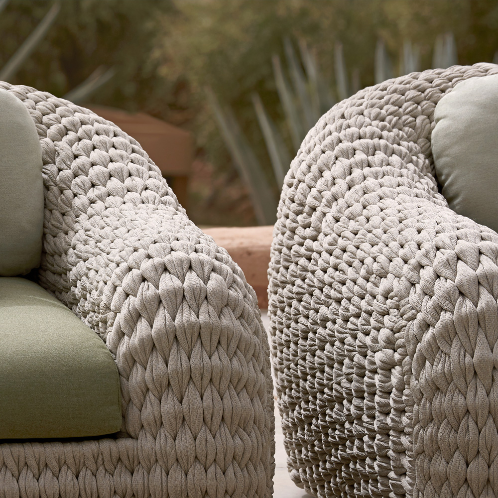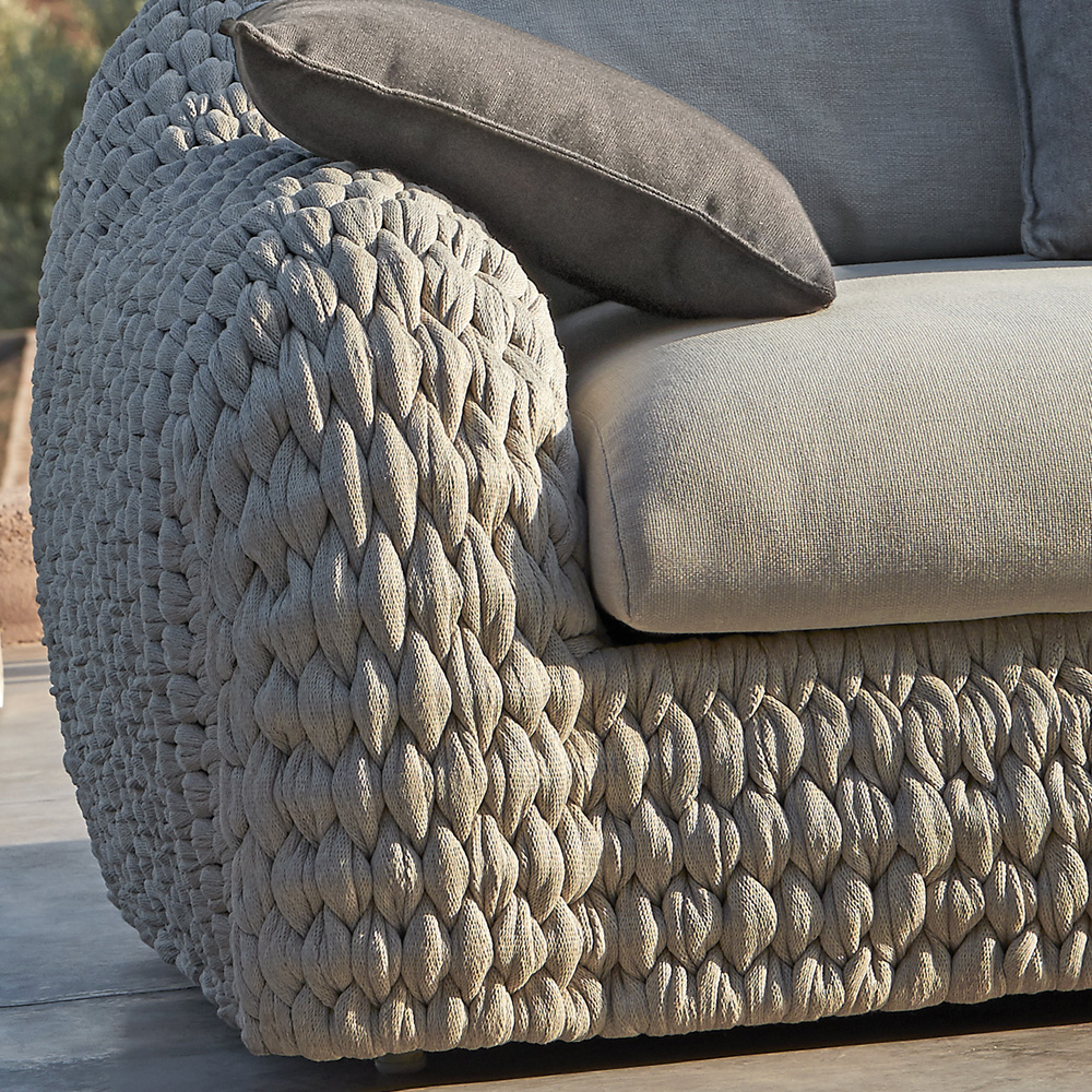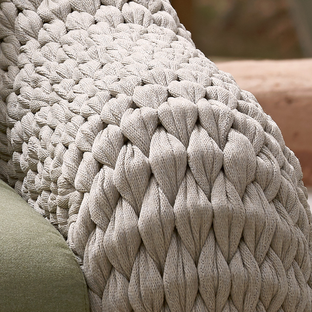 Deep plush seating with smooth curved lines, offering the ultimate in comfort and style. Technical complexity, each piece created by hand. Height 66.5 cm x width 114 cm x depth 105 cm, arm height 50 cm. Shown here in a contemporary taupe tone rope finish, an anthracite tone is also available offering a dramatically different effect. A Blend of Textilene® and polyolefin and UV-resistant. Swimming pool and sea water resistant and repellent. Easy to clean and maintain. Recyclable, GreenGuard certified, REACH certified. The finest of All Weather Fabrics, that have been specifically developed for outdoor use. The fabric is mass-coloured, UV-resistant and does not fade under the influence of light or sunshine. Padded using Quick Dry Foam, a foam with a special structure that ensures that the water runs through three times faster enabling it to ultimately dry three times faster than high resilience foam. This design is also available in a matching 3 seater sofa and lounger, creating a fabulous collection.