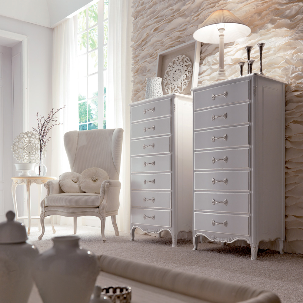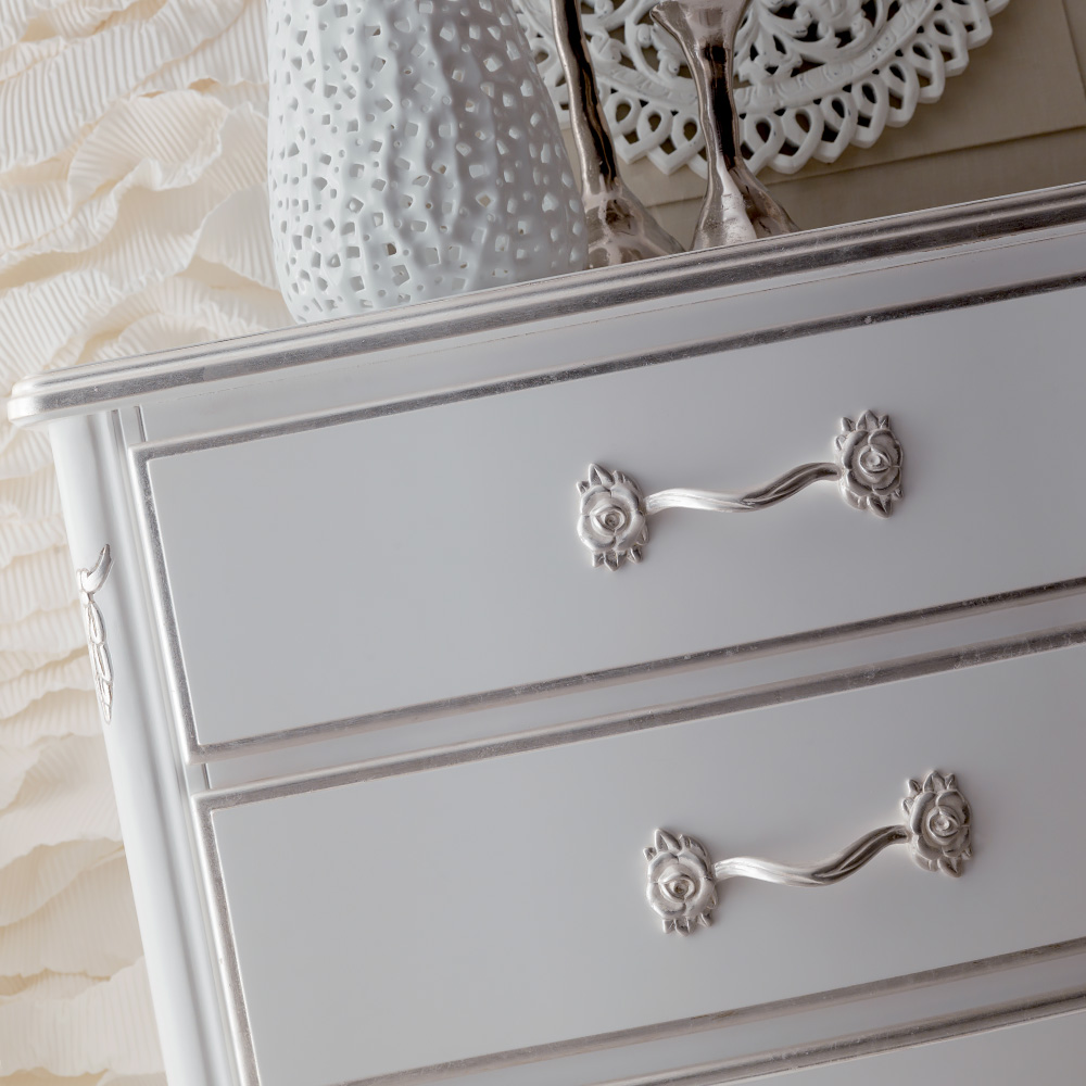 The Luxurious Italian Tall Boy Chest is truly striking, the perfect addition to any setting. Offering a fabulous classic storage solution. Fabulous in pairs, and a statement as stand alone. Finished in a fresh white porcelain painted finish with silver edge detailing and handles. Height 145 cm x width 70 cm x depth 49 cm. Available to order in different colours, finishes and with a marble or tempered glass top by request. Prices will vary.