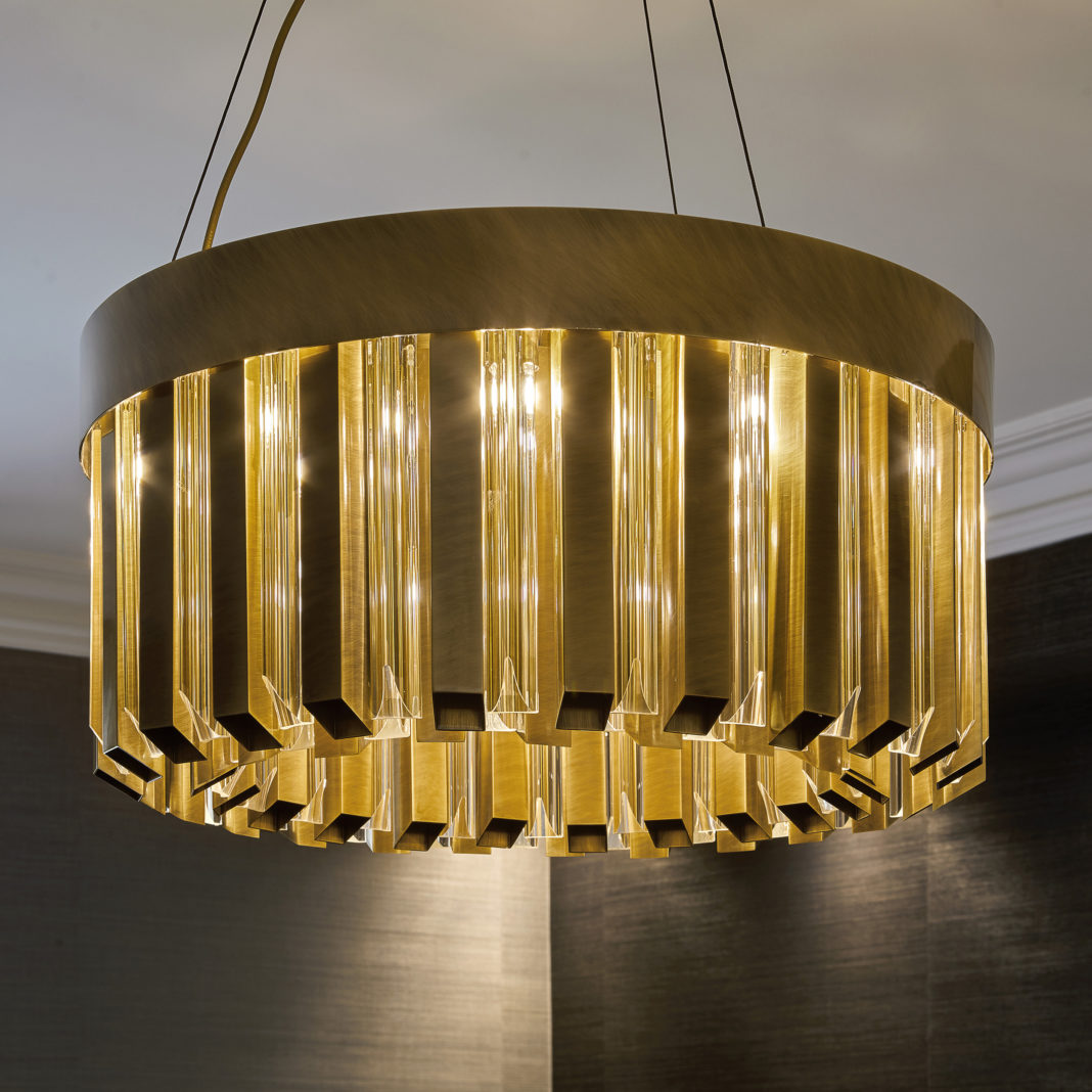 Clean lines with softer edges create a streamlined silhouette and powerful form, revealing a natural balance between a traditional and futuristic vision in lighting design. Based around a central structure, supporting cascading striking triangular sculpted glass and hollow square brass tube elements, shown here in an oxidised brass finish. Suspended via a modern ceiling rose in the same finish. In 4 sizes as standard. Height 35 cm – x diameter 60 cm, which requires 12 x G9 max 40W bulbs, included. Weight approximately 27 kg. Height 35 cm – x diameter 80 cm. Requires 20 x G9 max 40W bulbs, included. Weight approximately 36 kg. Height 35 cm – x diameter 100 cm. Requires 34 x G9 max 40W bulbs, included. Weight approximately 45 kg. And height 35 cm – x diameter 120 cm. Requires 28 x G9 max 40W bulbs, included. Weight approximately 54 kg. Plus 1 metre of cable as standard, further by request. Also available in various other finishes such as matt gold, polished, matt and brushed black and matt black nickel, polished, brushed and oxidised brass, and polished or brushed copper. Offering the ultimate in versatility.