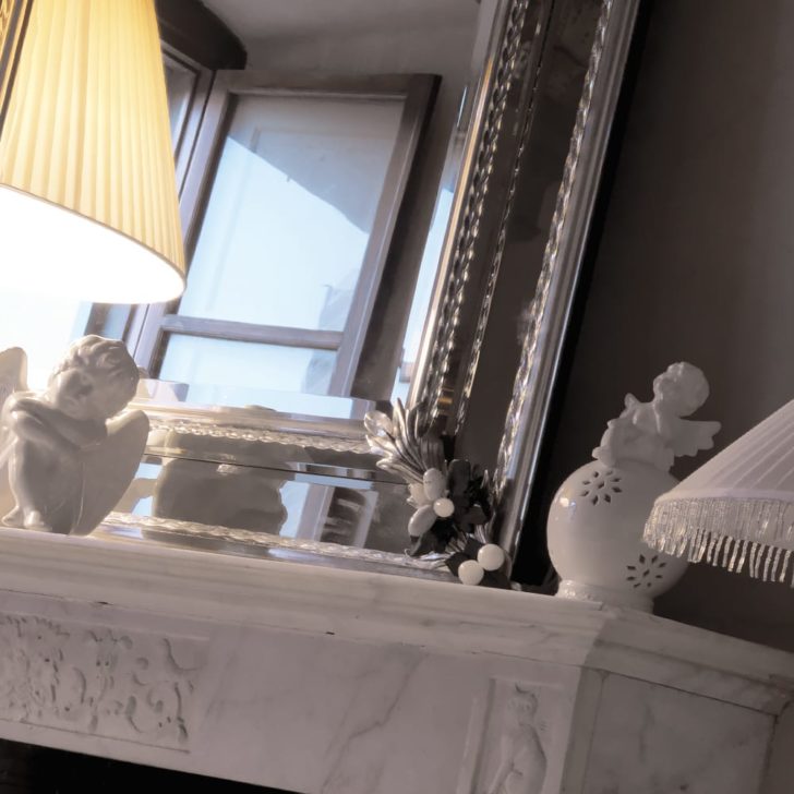 Ideal for over a fireplace, hallway or luxurious bedroom setting. Height 154 cm x width 92 cm. Also available to order in antique french gold or antique bronze and with Blue Lapis Lazuli, Black Onyx, Green Malachite or Red Diaspro. Prices will vary.