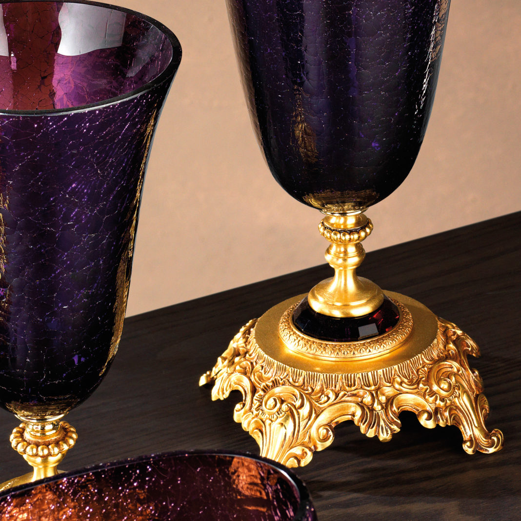 A beautifully detailed ornate brass structure in a French Gold satin finish, supporting a body of textured Amethyst hand blown glass. In 4 styles as standard. Large Vase – with glass detailing to the base, height 42 cm x diameter 20 cm – weight 2 kg and Small Vase, height 35 cm x diameter 17 cm – weight 1.8 kg. Centrepiece style bowl at height 23 cm x diameter 25 cm – weight 2.5 kg. And elliptical style bowl at height 28 cm x width 22 cm x depth 16 cm – weight 2 kg. Available with alternative finishes and in amber, ruby, green, blue or transparent glass colours by request. Prices will vary.