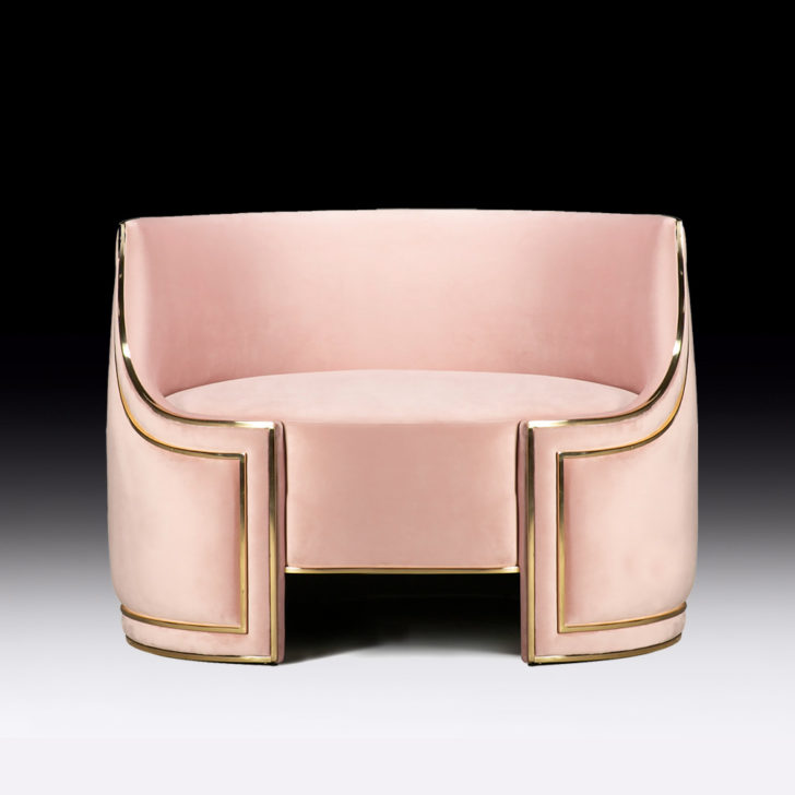 Finely executed by master craftsmen this armchair is outstanding in its use of luxury materials and attention to detail. A wooden structure, padded and upholstered to the highest standards in a beautiful pale pink soft velvet fabric. Feature brass details affirm its structure and silhouette. Creating a fabulous focus. Available to order in different colours, sizes, fabrics and finishes by request. Prices will vary.