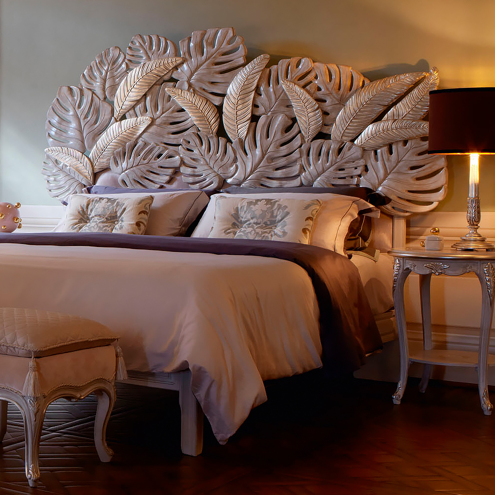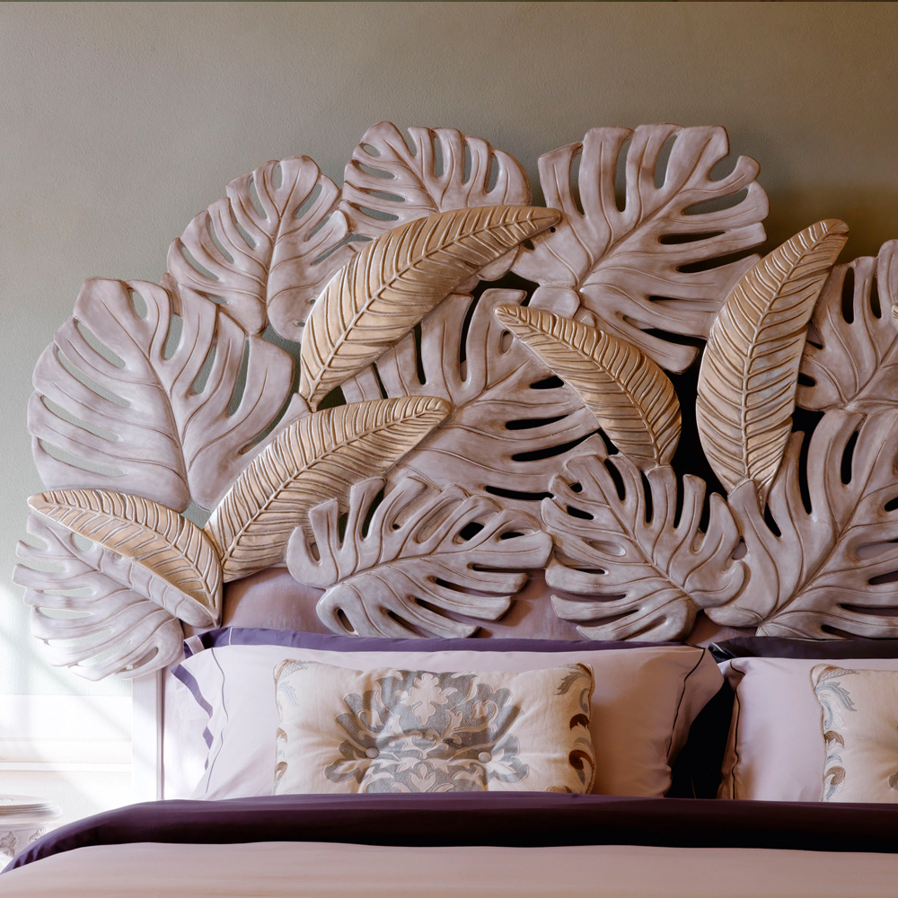 The Luxury Bed With Tropical Palm Leaf Headboard offers an accomplished opulent design with unmistakable style and presence. Striking in its dimensions. Ultimately glamorous and sophisticated, creating a sanctuary within any setting. A place to indulge yourself and above all create a sense of calm after a long day.