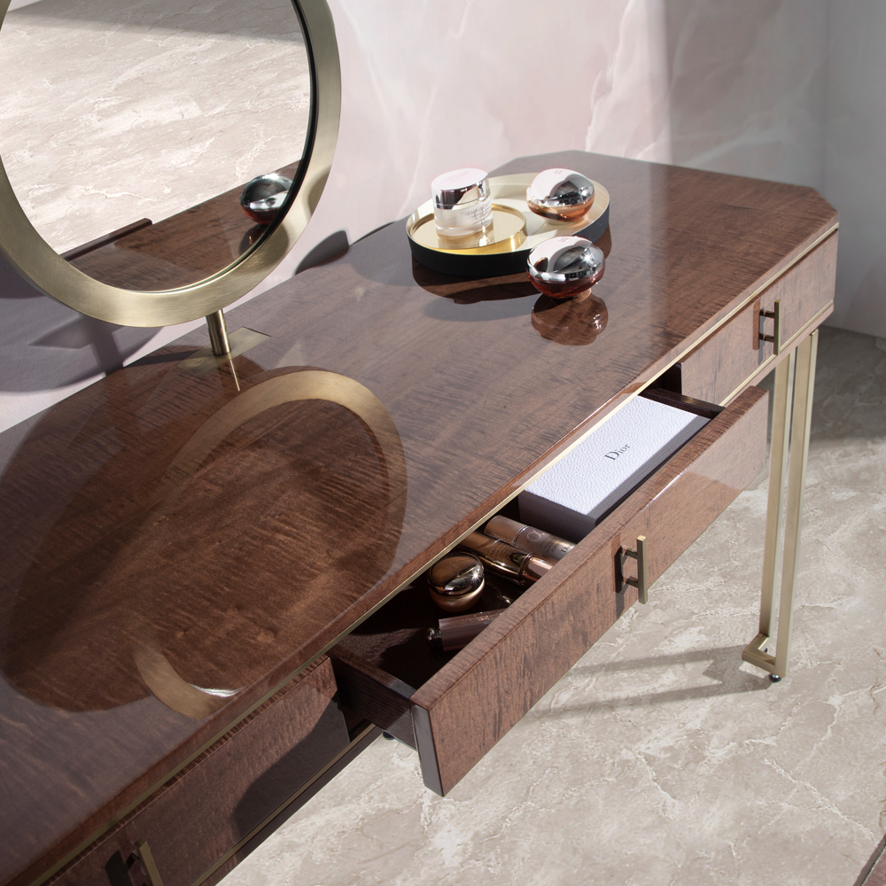 This decadent dressing table is centred with a round mirror and showcased in a high sheen brown maple veneer. This is seamlessly complemented by sleek brass metal detailing on the table legs. Features three drawers for ample storage space. Alternative metal and wood finishes are available upon request. Prices will vary.