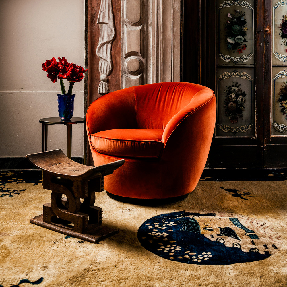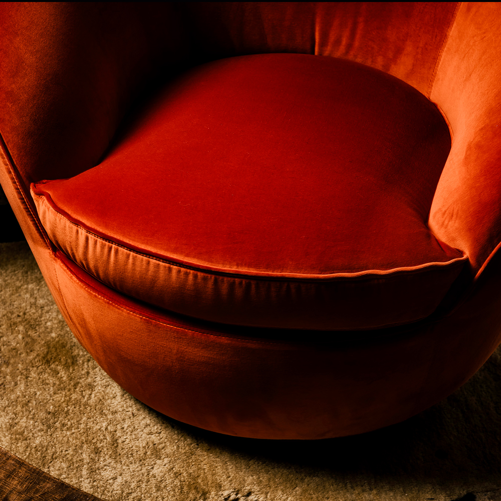 A solid beech wood structure, padded in foam and memory foam in various different densities and upholstered to the highest standard in the finest burnt orange velvet with statement piping detail. The piping can be self fabric as shown or in a contrasting mocha leather, upon request. Features a stunning 180 degree rotating base, beautifully upholstered in the finest leather and adding a retro accent. Seat height 43 cm, and seat depth 56 cm. Alternative finishes, a variety of leathers, fabric in various shades including customers own and in customised sizes. Prices will vary.