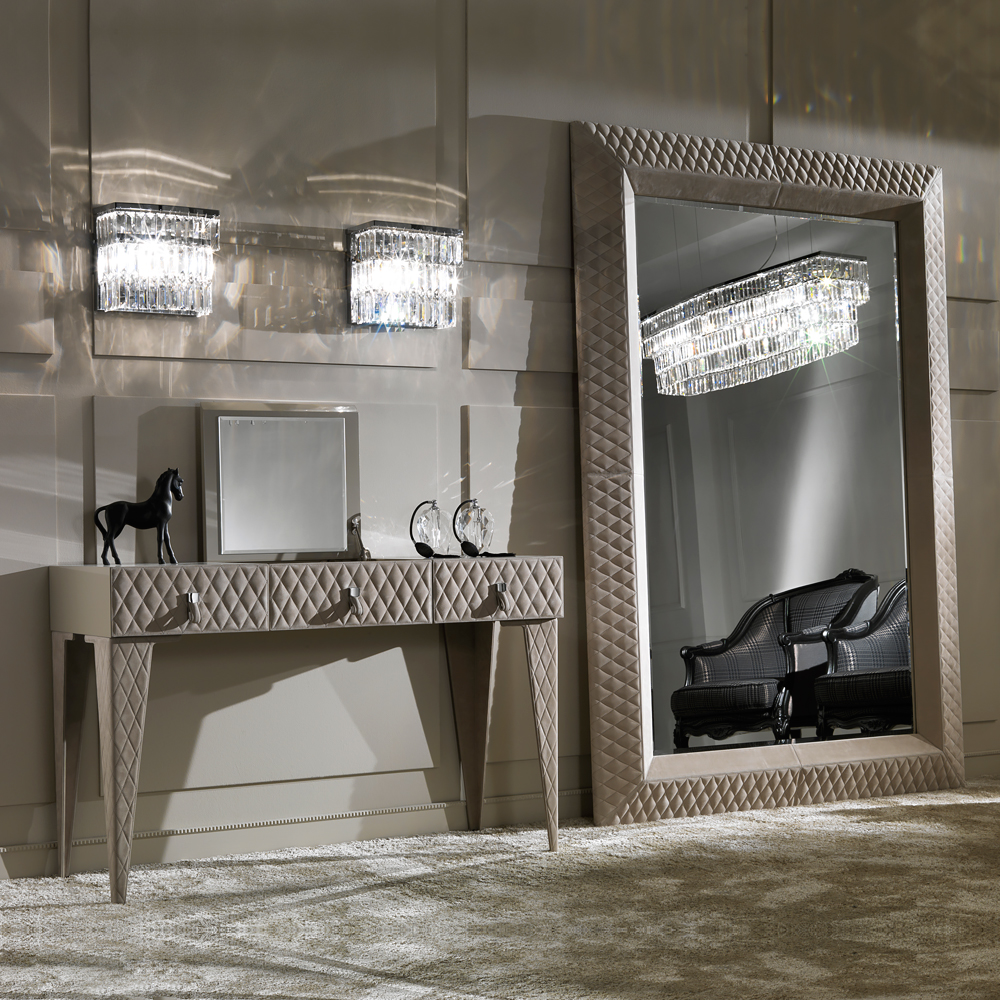 Luxury Freestanding Quilted Nubuck Leather Mirror. Providing the ultimate design in which to add superb style and charisma to your interior design. This luxurious modern mirror is made of solid wood and shown here beautifully upholstered with the finest quilted taupe nubuck leather. An outstanding design which combines perfectly with the luxury dressing table shown here in the same gorgeous quilted leather, creating a fabulous focus indeed.