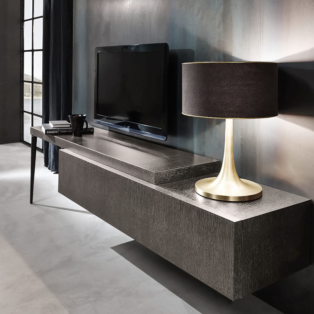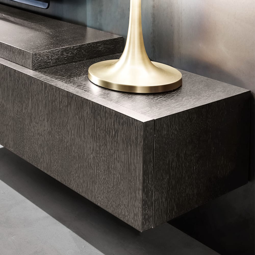 The Luxury Italian Designer Extendable Media Unit is a real statement. This unique wooden media table, with wall unit and extendable top offers unmistakable contemporary Italian style. The stunning veneered carbon oak finish provides an elegant yet striking focus, furnishing your home with impeccable style. Adding a touch of glamour and sophistication to distinguished interior design.