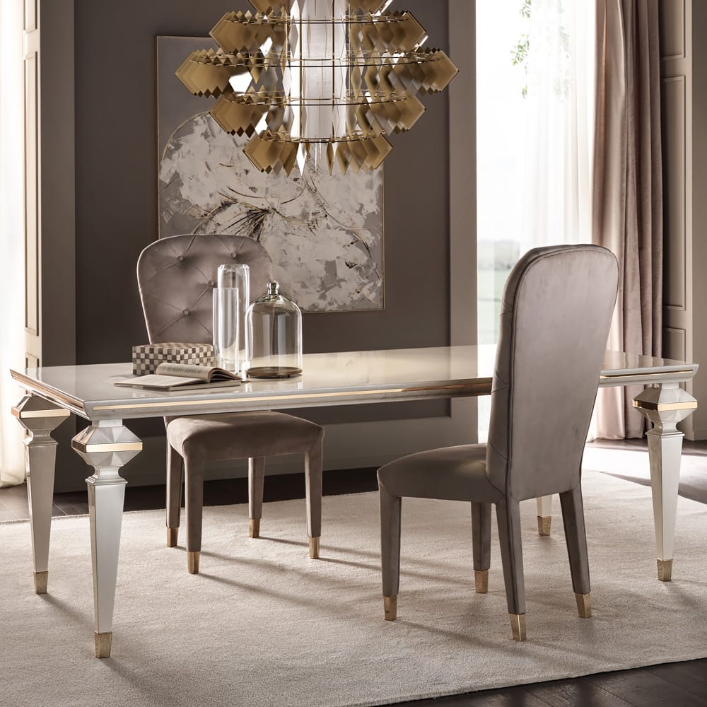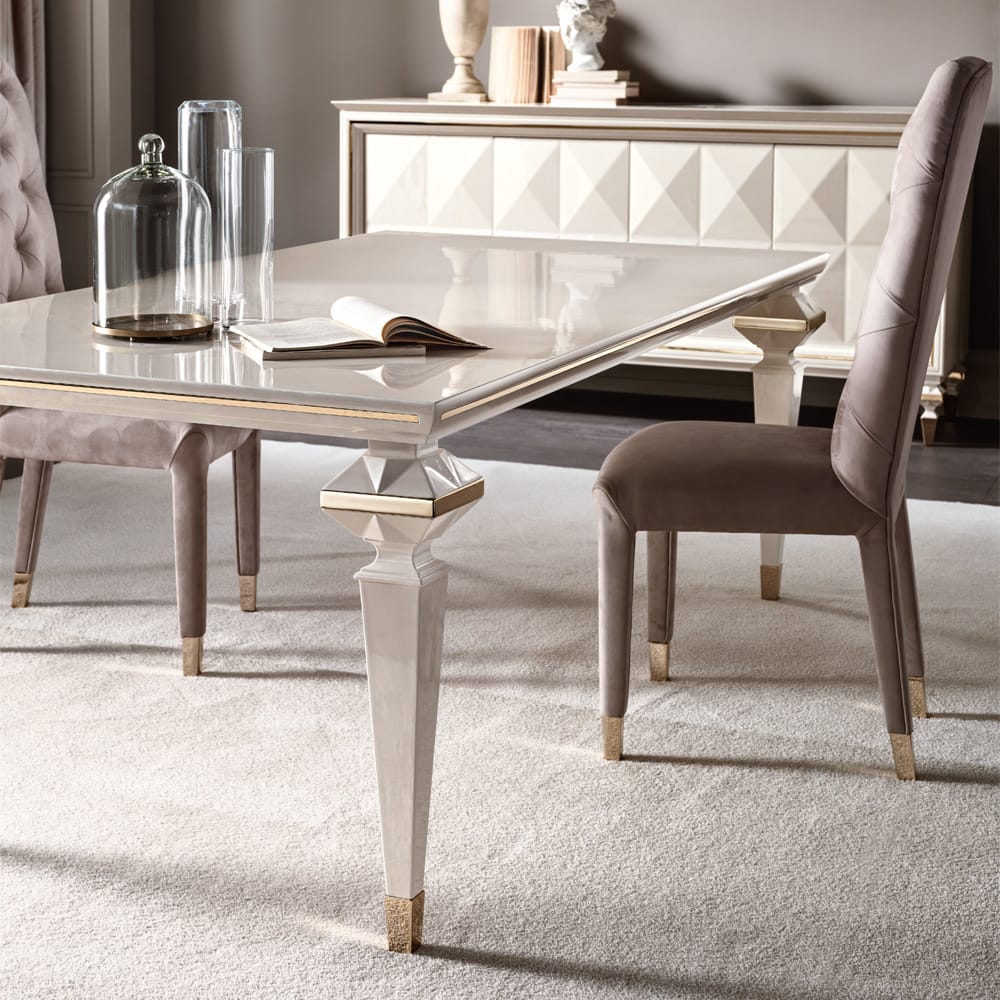 An exquisite rectangular table, beautifully fashioned by the finest Italian furniture makers in a stunning mother of pearl finish. Feature diamond inspired faceted legs define this design, completed by iron insert detailing and glides in a pale gold finish. Creating a spectacular focus, with the ultimate attention to detail. Height 74 cm x width 206 cm x depth 106 cm, weight 60 kg. Paired with the Luxury Italian Button Upholstered Nubuck Tall Dining Chair, padded in various densities, button upholstered to the highest standards and impeccably handcrafted in a divine taupe nubuck leather. Completed by statement iron glides in a pale gold finish. The ultimate in timeless classic style and comfort. Height 116 cm x width 50 cm x depth 63 cm, seat height 49 cm. Weight 15.5 kg. Available with alternative sizes and finishes by request. Prices will vary.