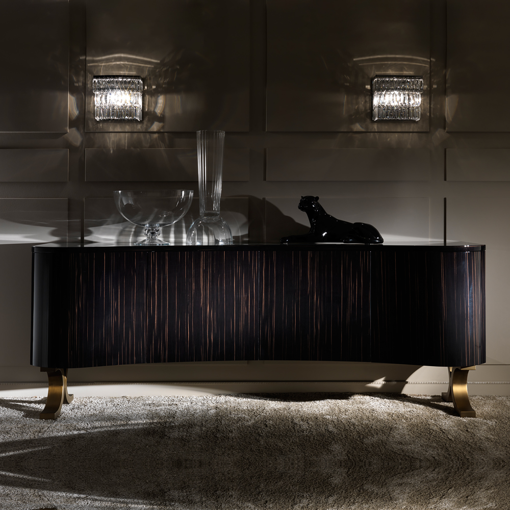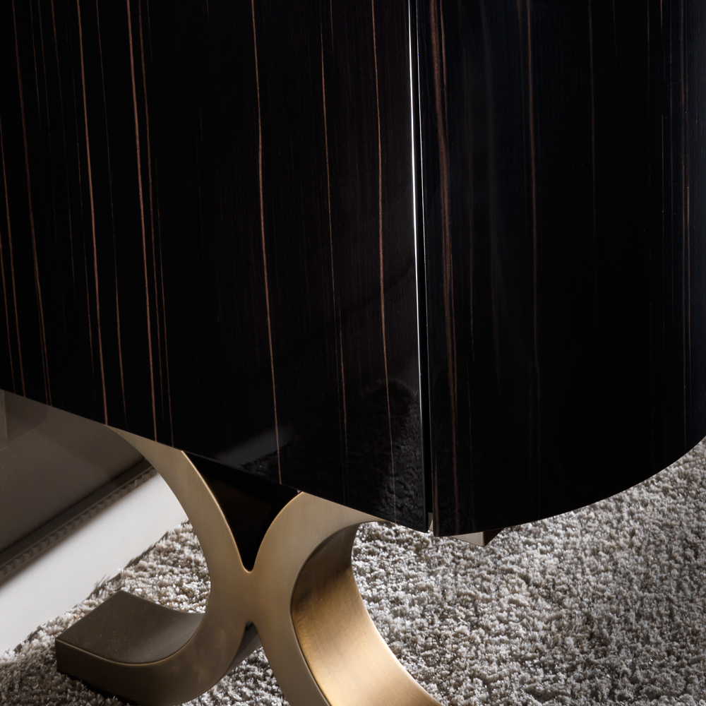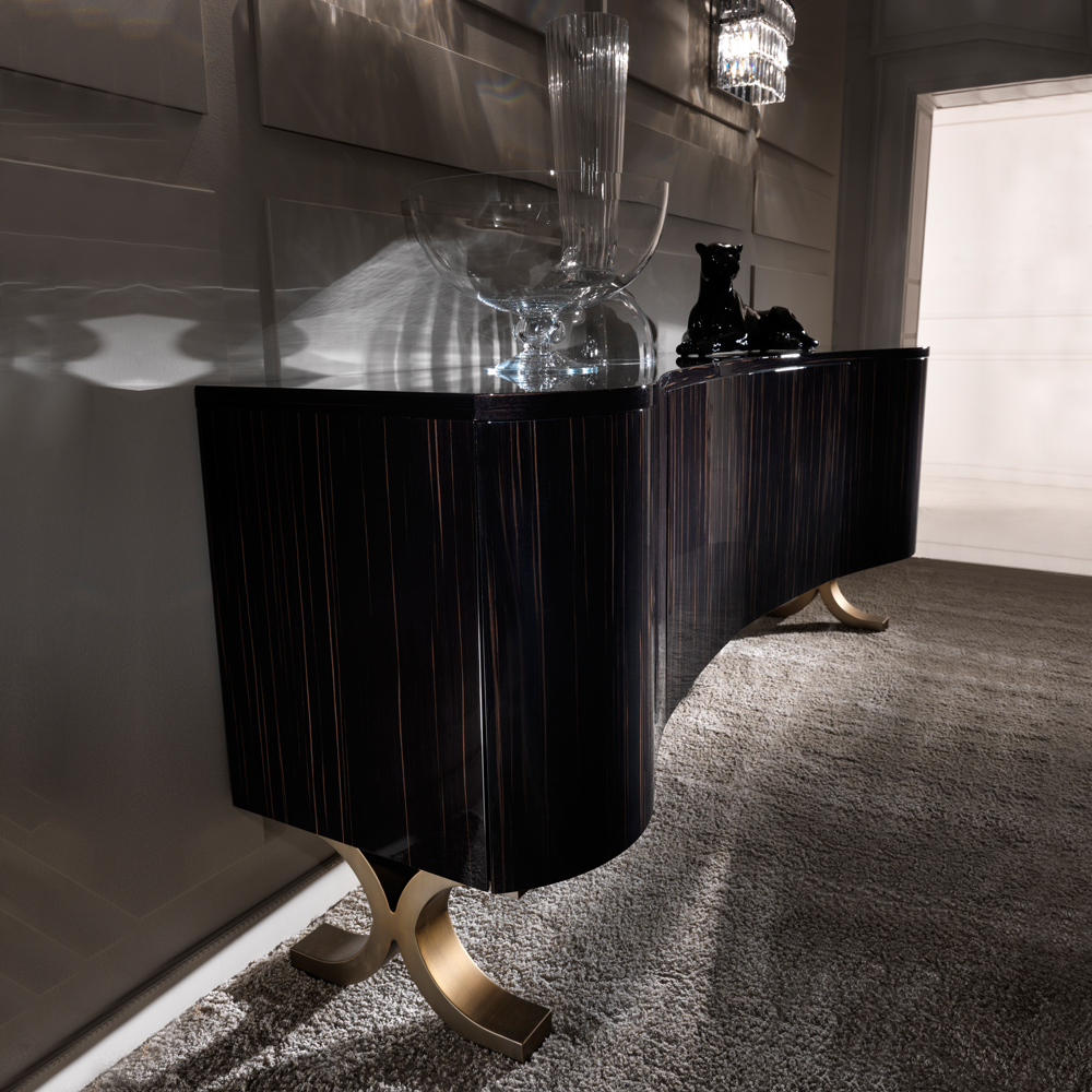 Luxury Italian Ebony Veneered Buffet. This exceptional buffet offers superb true Italian style, seductively modern and elegant. Outstanding in its shape and form the curved design offers a tactile focus giving prominence to the exquisite Macassar Ebony veneer. The stainless steel feet have an antique bronze finish creating a superb accent providing a glamorous storage solution indeed. Offering 4 doors with a push open system accentuating the streamlined appeal. Use this beautiful sideboard as a glamorous focus in a dining or living room.
