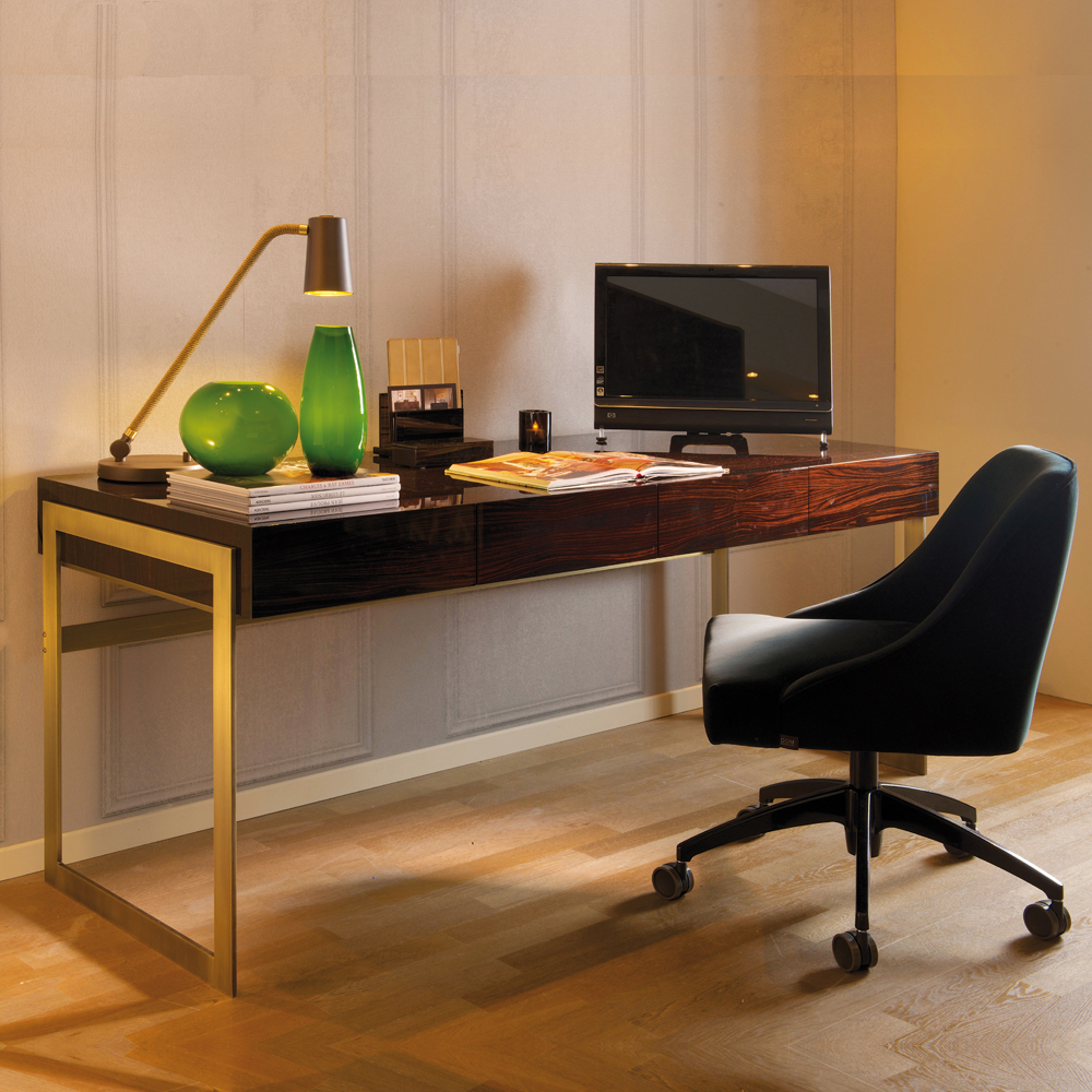 Beautifully finished in high gloss Macassar Ebony veneer, the striking structure adds an impressive contemporary atmosphere to any office or boardroom setting. Featuring a 15 cm deep top, boasting 2 drawers lined with beautiful mirror. Statement style metal legs in bronzed finish, complete this sophisticated design. Height 78 cm x width 182 cm x depth 70 cm. Also available in alternative veneers including Macassar ebony wood in a matt finish. Alternative steel finishes include polished brass and polished chrome. Prices will vary.