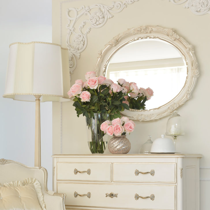 Luxury Italian Rose Oval Wall Mirror. Shown here with a fabulous antique white and silver finish, perfect over a fireplace or luxurious bedroom setting. Height 91 cm x width 106 cm. Also available to order in different colours and finishes including gold and silver, or combinations of colours. Please ask for details.