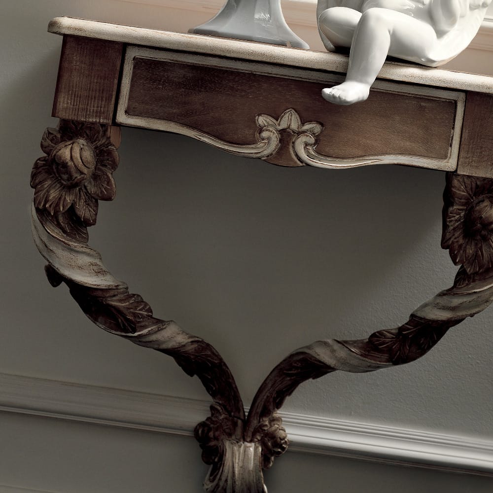 The Luxury Italian Wall Fixing Bedside Table with drawer. Shown here in a rich two-tone antique finish with a wooden top, also available to order in different finishes and a marble top. Height 56 cm x width 56 cm x depth 39 cm.