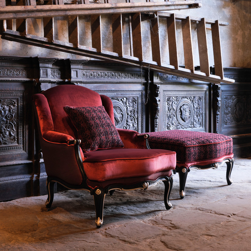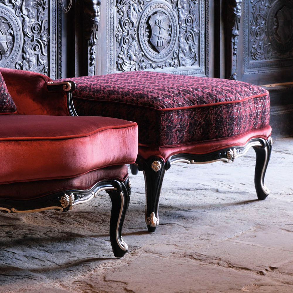 Superbly executed by master Italian craftsmen these designs are outstanding in their use of luxury materials and attention to detail. Shown here in an Antique Black finish with accents of Silver accentuating the exquisite curves and floral carvings. Padded and sumptuously upholstered in the finest quality luxury velvet, two-tone textured and rich houndstooth fabrics. Completed by luxurious feature piping detail, creating a fabulous focus. Armchair height 95 cm x width 80 cm x depth 95 cm, and footstool height 51 cm x width 80 cm x depth 82 cm. Available in various other leathers, fabrics and finishes. Prices will vary. Scatter cushion is available, but not included.