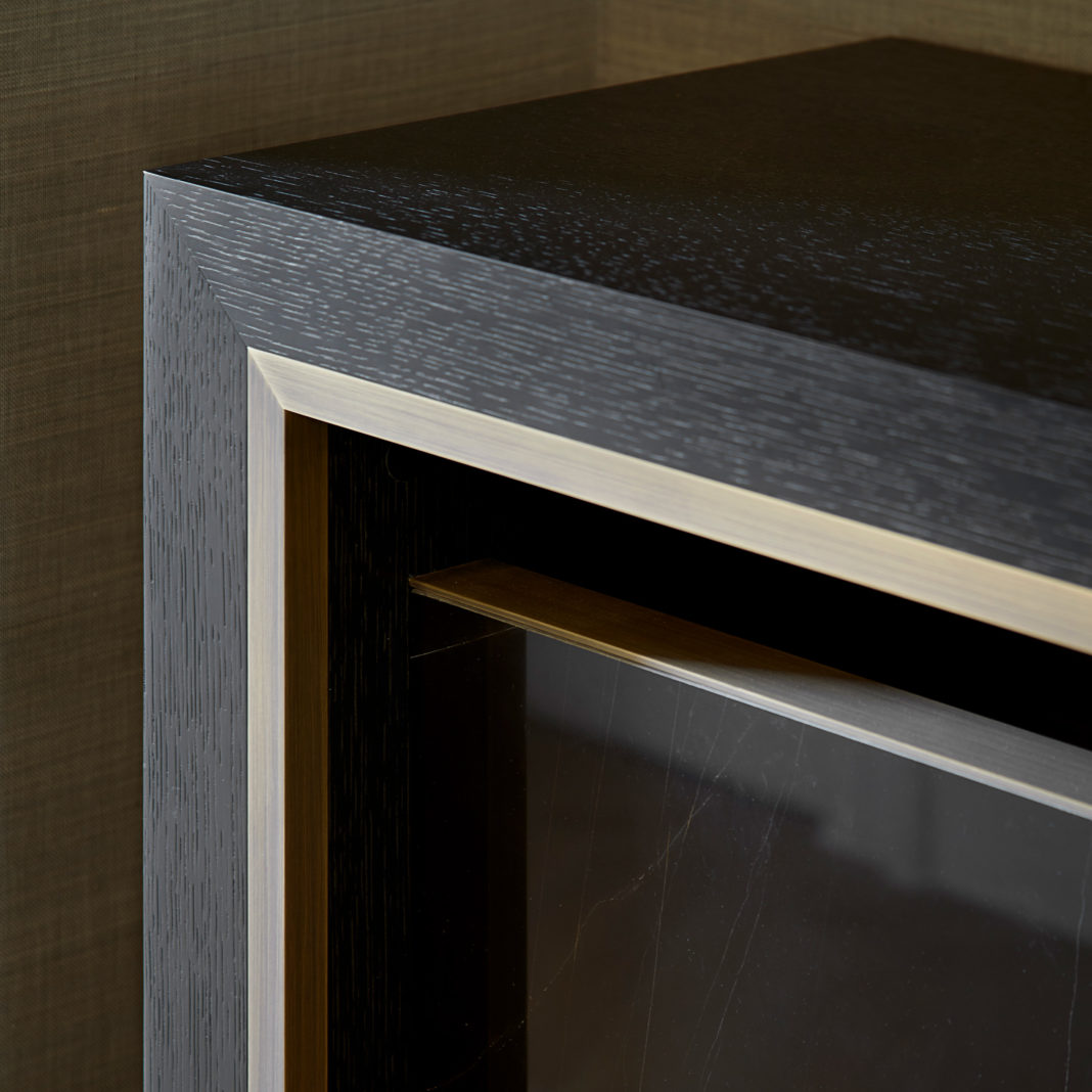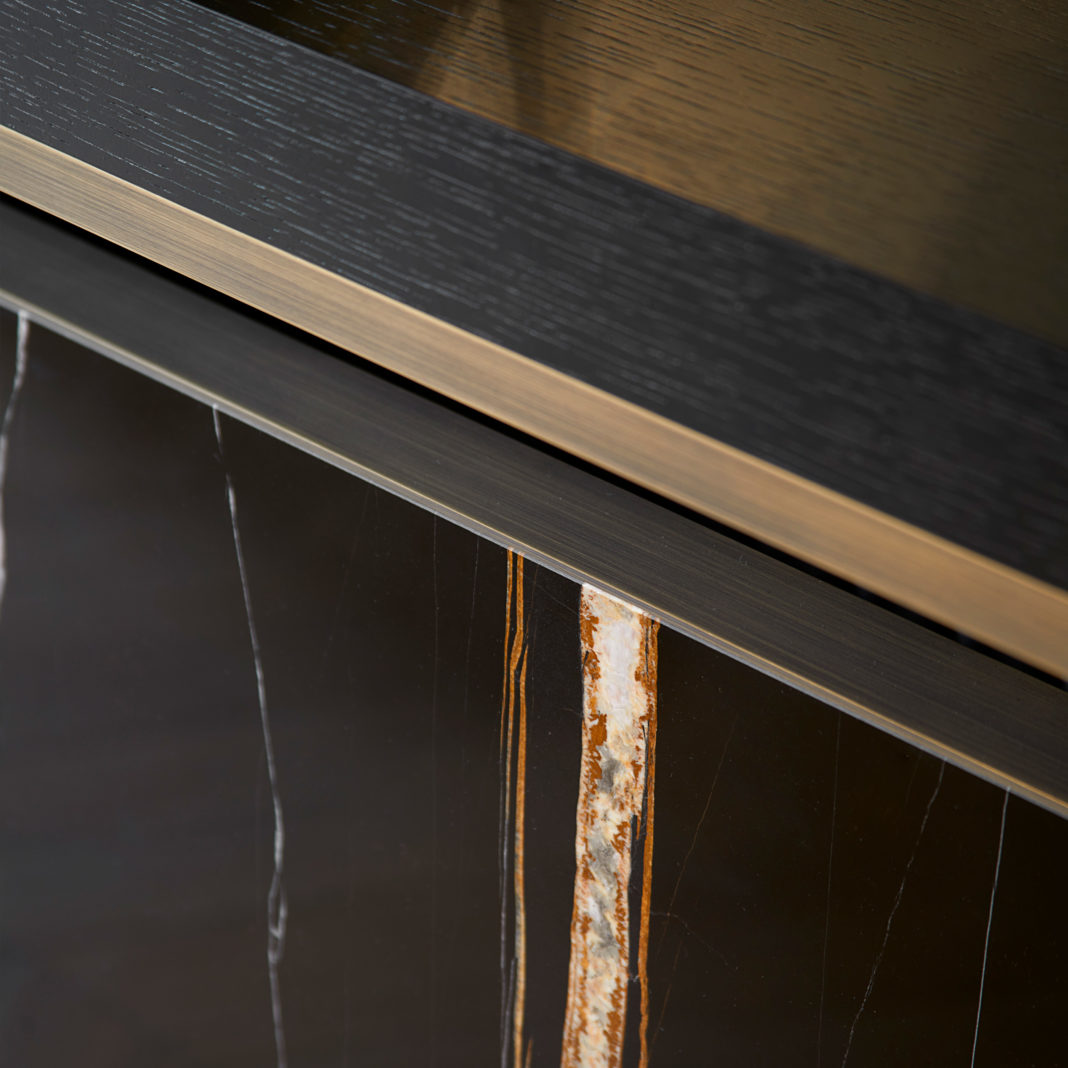 Superbly executed by master craftsmen this fabulous piece is outstanding in its use of luxury elegant materials and attention to detail. A harmony of forms. Designed in a fabulous Art Deco inspired style in a combination of oak veneer, striking Sahara noir marble and brushed brass detailing. Alternative colours, finishes and special sizes are also available by request. Prices will vary. Mirror also available by request.