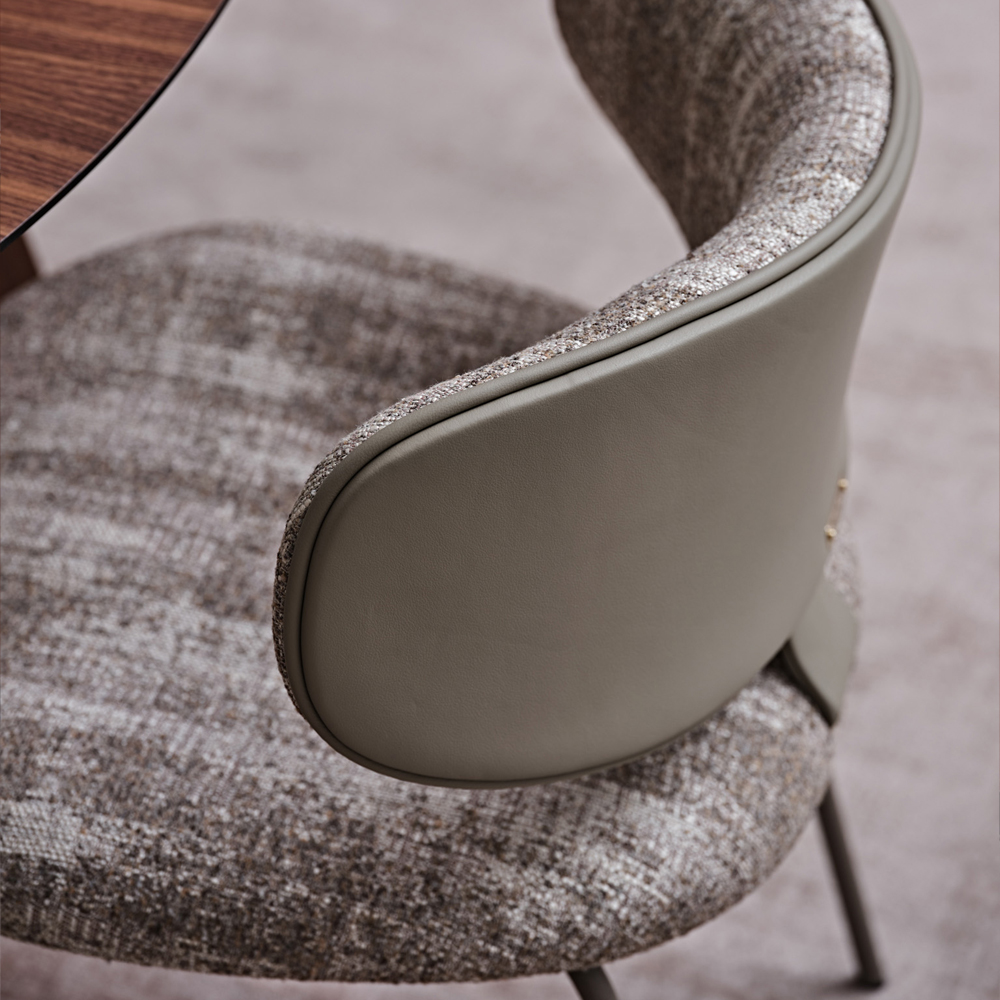 A solid beech wood curved structure, padded in foam and memory foam for the ultimate in luxurious comfort. Shown here upholstered to the highest standard in a contemporary two-tone textured luxury fabric. The back panel, piping and bracket are finished in a faux leather which outlines the elegant profile. On stylish metal legs in a brown varnished finish. Covers are not removable. Seat height 47 cm and seat depth 45 cm. Alternative leg finishes, leathers and fabrics including customers own in various combinations and customised sizes by request. Prices will vary.