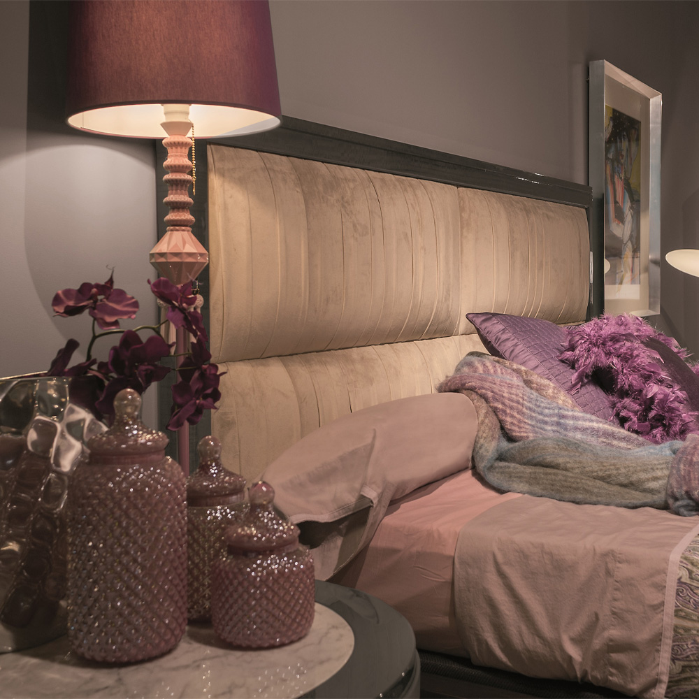 This chic king size bed, to fit a 180 cm x 200 cm mattress – boasts a high sheen grey eucalyptus wood finish frame and luxurious pleated velvet upholstery on the headboard, sublimely complemented by a sleek brass trim. The bed features an optional handy storage lift base, alongside pleated velvet upholstery on the headboard. Available in a variety of finishes. Prices will vary.