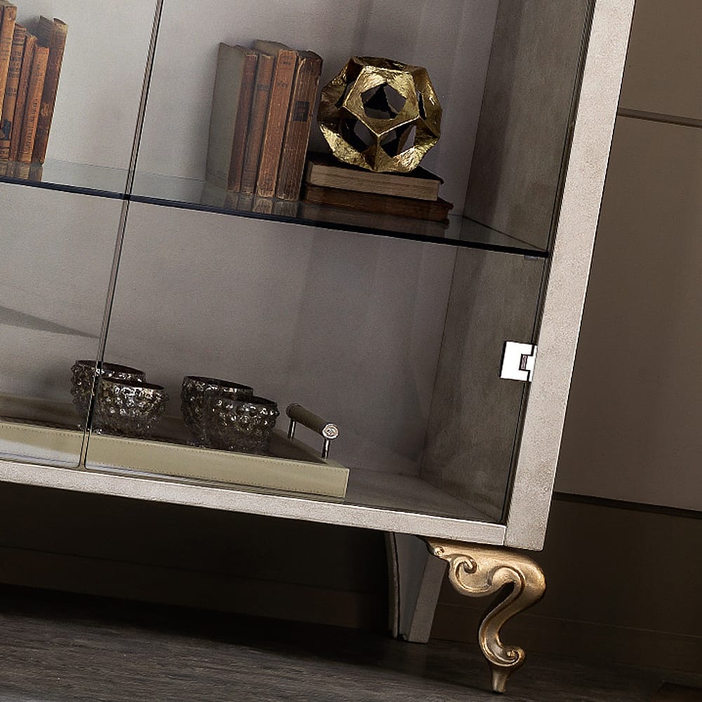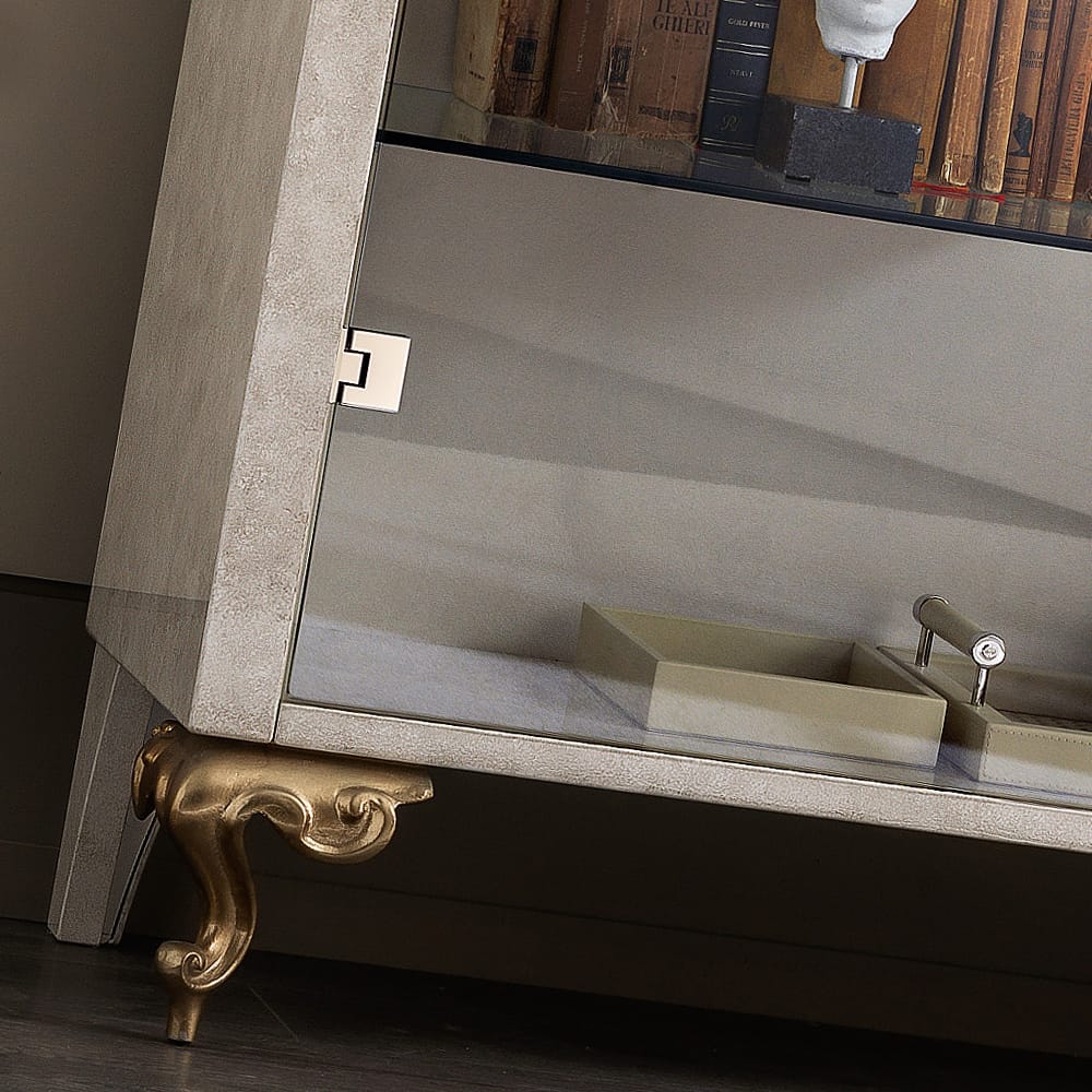 The beautifully frame is finished with a fabulous mother of pearl finish, together with feature handles in a luxurious pale gold finish. Featuring four glass interior shelves and two fully glazed doors, providing a handsome storage solution indeed. Includes front feet in an equally stunning decorated bronze finish. Feet are beautiful curved, featuring unique detailing, altogether providing eye-catching accents. For versatility this elegant design is available in alternative colours and finishes such as the main cabinet in a decorated bronze finish or antique Mother of Pearl. Alternative sizes are available by request. Prices will vary.