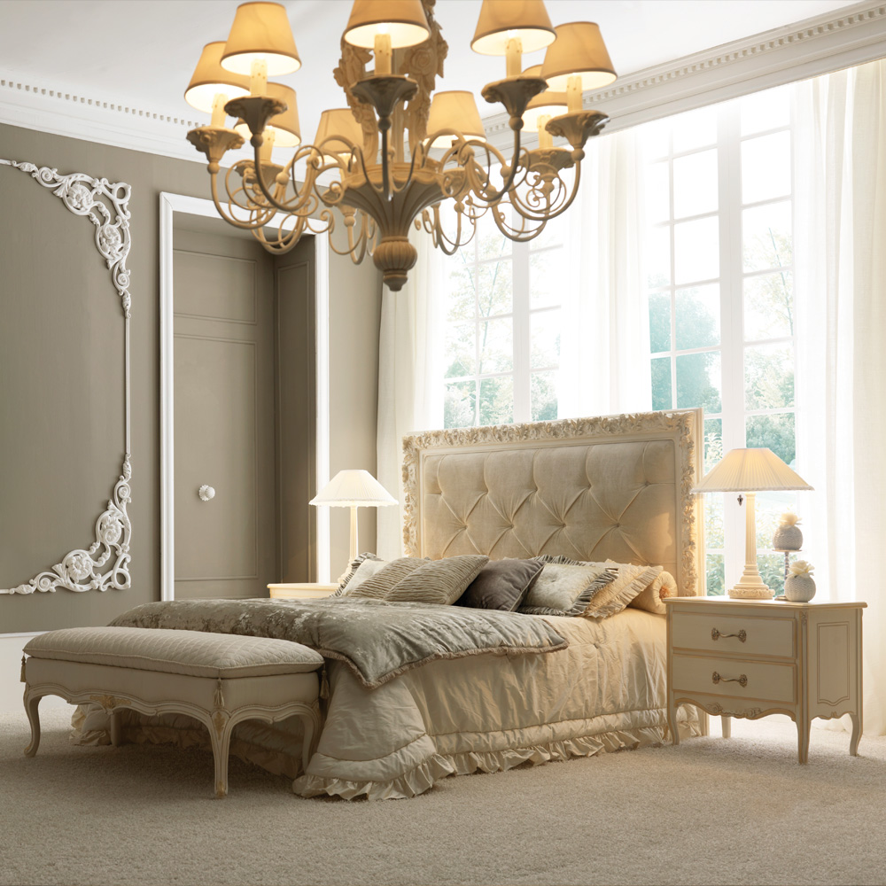 The Luxury Ornate Button Upholstered Bed, shown here in a delicate antique white and bleached gold hand painted frame and button upholstered with a high quality ivory velvet. Size shown to fit mattress 170 cm x 200 cm, overall size height 150 cm x width 187 cm x depth 210 cm. Other sizes are available to order with alternative fabrics, including customers own fabric and leather, frame colours and finishes and also as a headboard only.