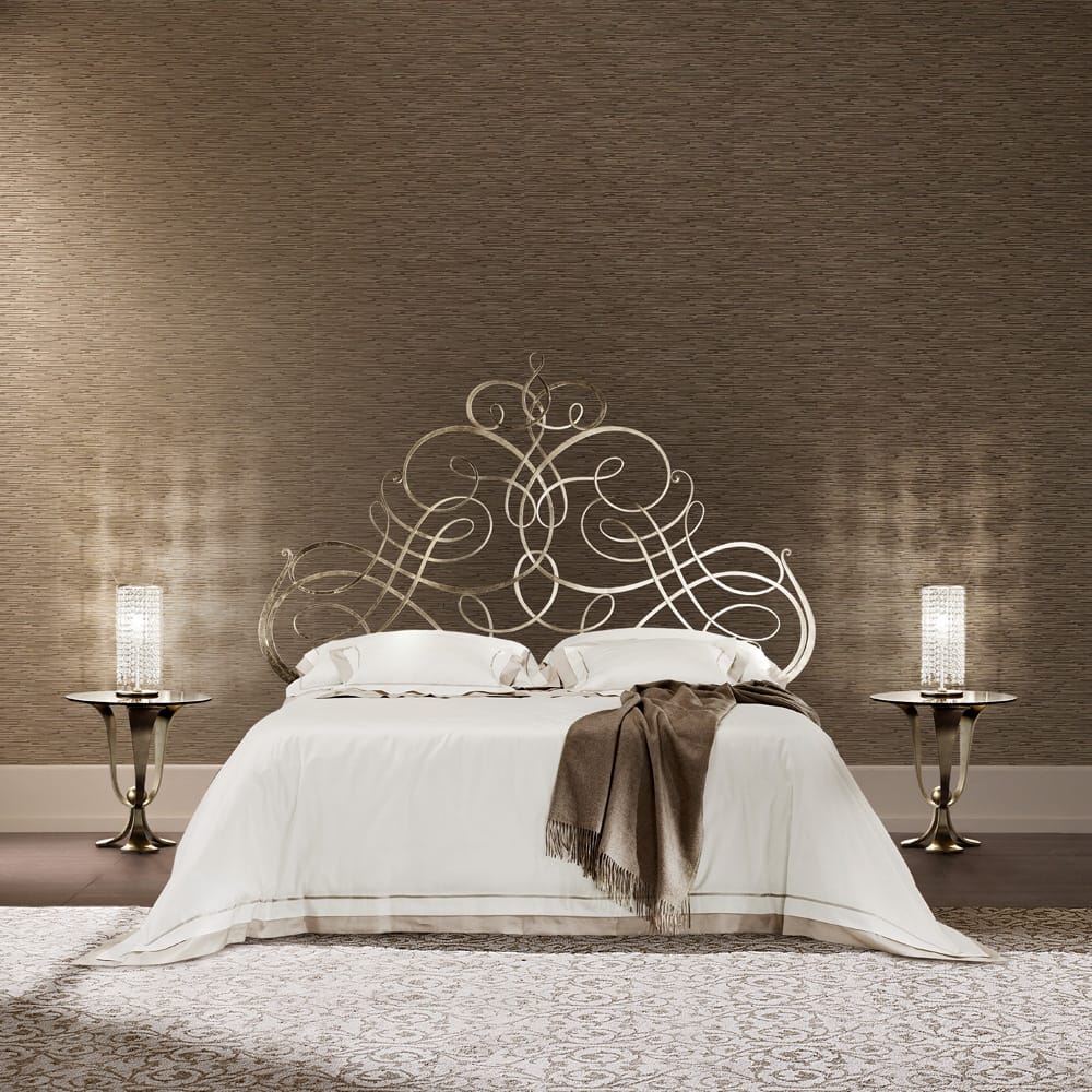 Made by the finest Italian furniture makers with superb attention to detail. A remarkable modern wrought iron structure, laser cut and polished by hand. In a fabulous champagne leaf finish, completing this remarkable modern design. In three sizes as standard. Please note that mattress size is smaller than the bed frame. Headboard, base and slats are included in the price. This exquisite bed is also available also available as storage bed, with a footboard, as a wall mounted headboard only and in an array of finishes such as lacquers, leafs and mother of pearl. Bespoke sizes upon request. Prices will vary.