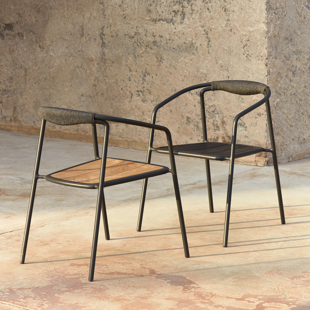 Superbly executed by master craftsmen this design is outstanding in its use of luxury materials and attention to detail. Composed of two connected frames made of bent aluminium, giving the impression of being held together by ropes. Shown here with brushed teak slatted seat panels. Height 77 cm x width 55.5cm x depth 63.5 cm, seat height 45 cm + cushion 4 cm – overall seat height 49 cm. Weight 7 kg. Technical complexity, each piece created by hand. Shown here with an intriguing mix of a powder coated aluminium frame and contemporary 4.5 mm woven rope. Various combinations are available, as shown. Protective cover also available by request.