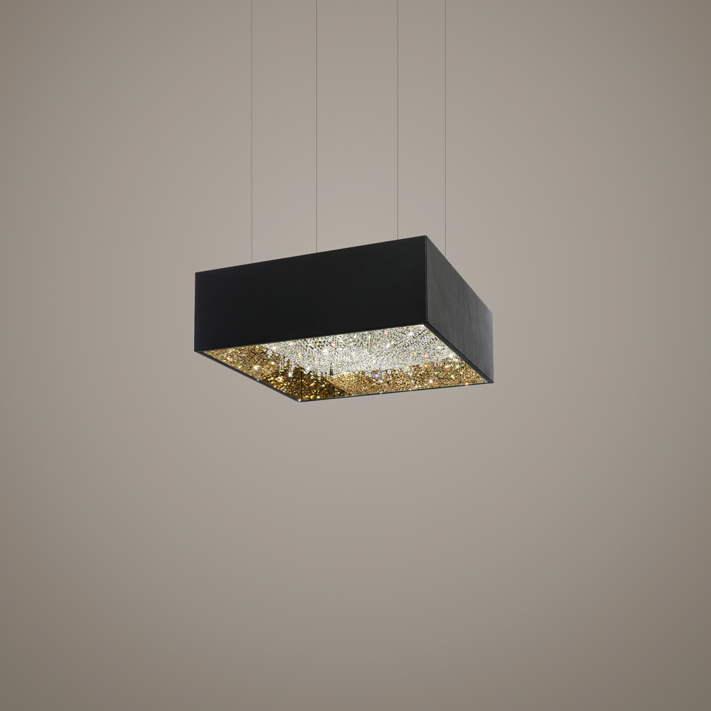 This suspended chandelier features a structure in polished stainless steel, an interior bronze mirror, and an exterior painted in black wood adorned with a plethora of full-cut crystal octagons and pendants. Suspended from 250 cm-long transparent hanging cables. Compatible with a phase cut, dimmable system and requires 28-watt G9 halogen bulbs, which are included as standard. Prices will vary.