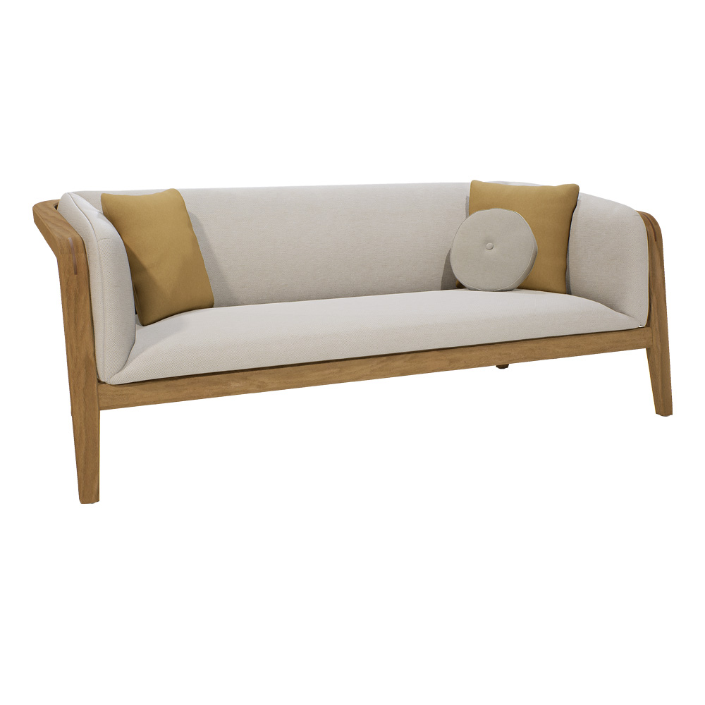 Clean lines and strong curves add to the collections ageless appeal. The warmth of its materials and welcoming form offer an irresistible invitation. Brushed Teak and light tones giving a certain prestige, offering the ultimate in comfort. Superbly executed by master craftsmen this design is outstanding in its use of luxury materials and attention to detail. Swimming pool and sea water resistant and repellent. Easy to clean and maintain. Recyclable, GreenGuard certified, REACH certified. The finest of All Weather Fabrics, that have been specifically developed for outdoor use. The fabric is mass-coloured, UV-resistant and does not fade under the influence of light or sunshine. Also available in a Dark Teak finish, and in a variety of fabric combinations as shown. This design is part of a fabulous collection, including a dining set and sun loungers.