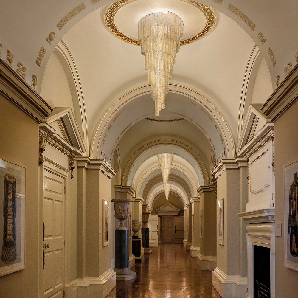 Striking in its dimensions, a painted metal frame supports spiralling tiers of elegant strips of hand made amber cast glass in a graniglia or grit finish. A process where a fine grit is mixed with the glass while it is still molten to create a finely-textured surface. Requires 14 x E27 x 20 W max bulbs, not included. Weight 63 kg. Part of a fabulous collection, wall light and spiral chandelier also available.
