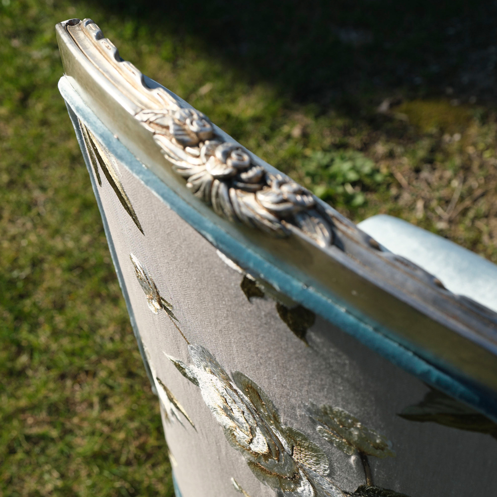 Shown here in an Antique Silver finish, accentuating the exquisite curves and ornate carvings. Padded and sumptuously upholstered to the highest standards in both a linen mix fabric with exquisite embroidered detailing and a rich velvet fabric, completed by luxurious feature contrast piping detail. Creating a fabulous focus. Available in various other fabrics, combinations, leathers and finishes. Prices will vary.
