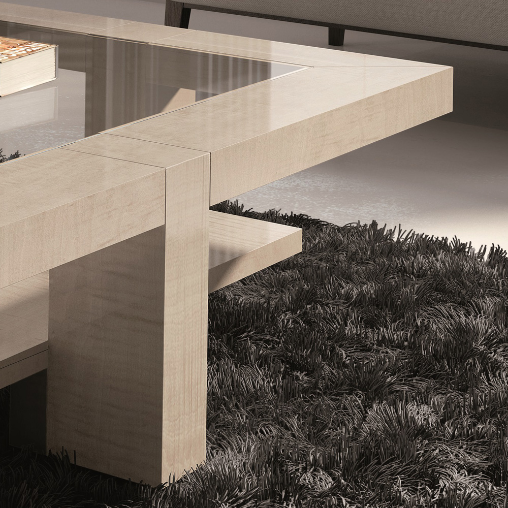 This coffee table features a high sheen white maple wood finish, complete with a glass top. Available in a variety of finishes. Prices will vary.