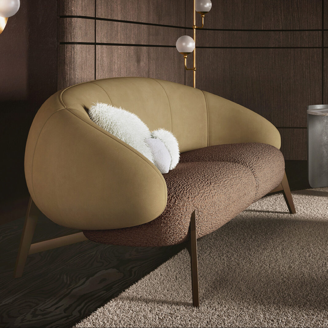 A fully engineered, hand-finished solid beech wood frame anchors the piece, enhancing both its beauty and enduring quality. Showcasing exceptional craftsmanship, padded in density 30, and upholstered to the highest standard in a rich premium quality soft leather and an on trend bouclè fabric. Enhanced with piping detail and exuding understated luxury. Covers are not removable. Weight 65 kg. Also available in alternative wood finishes, fabrics, leathers by request. Prices will vary. Matching Armchair also offered.
