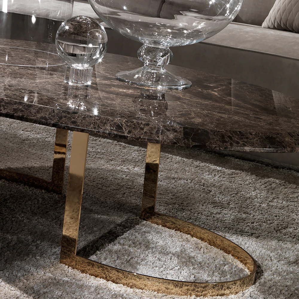 The Modern 24 Carat Gold Plated Oval Marble Coffee Table. This hand-crafted oval design offers unmistakable Italian style indeed. Superbly executed by master Italian craftsmen this fabulous coffee table is outstanding in its use of luxury materials and attention to detail. Offering the ultimate in luxury and glamour a bevelled Emperador marble top is used in superb contrast with a stylish stainless steel base, finished dipped in 24 carat gold. As shown measures height 42 cm x width 140 cm x depth 90 cm.