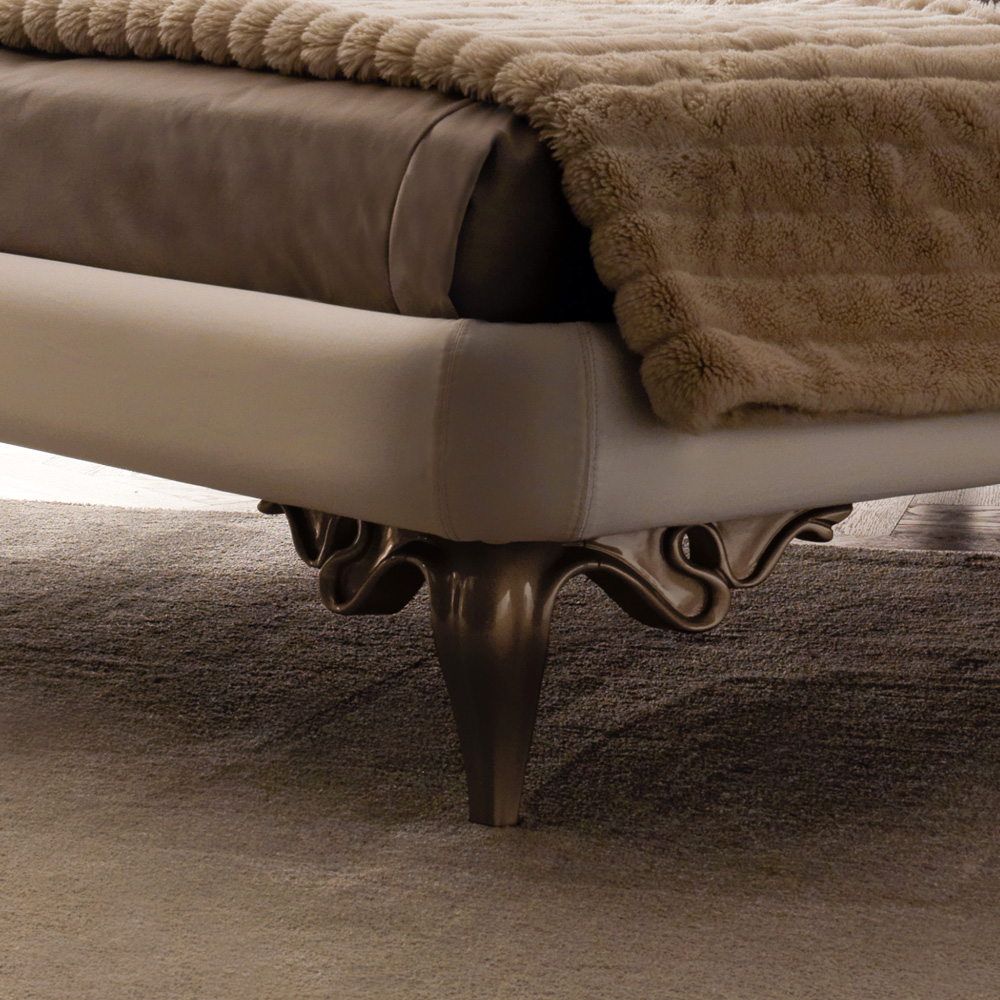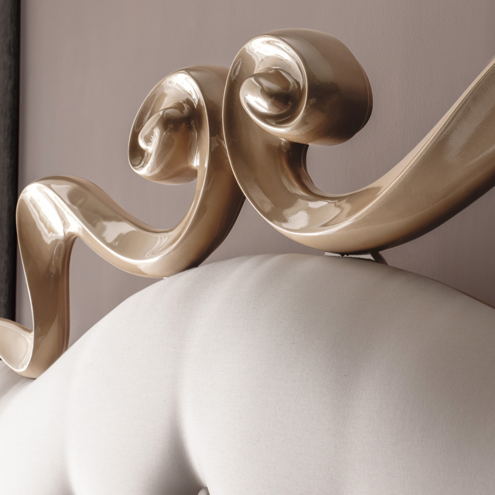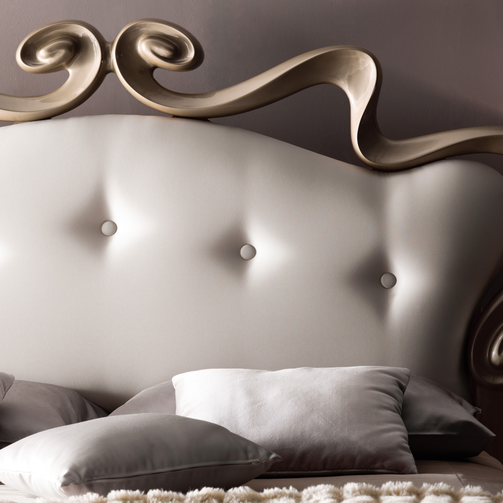 The primary focus of this design is the sensational swirls of the solid wood hand polished headboard and feet in a warm high gloss lacquered finish. A wooden frame and base, upholstered with the finest five button upholstery detailing and padded in different densities to the highest industry standards in the finest ivory fabric. These cohesive design features bring together the bed, providing an exceptionally stylish design feature. The fundamental basis of any luxury bedroom. Base includes tension regulator slats. Shown here for mattress width 180 cm x length 200 cm. Other sizes are available. And with other upholstery such as leathers, faux leathers and luxury fabrics, including customers own and other finishes. Prices will vary. An eleven button upholstered headboard is also an option, prices will vary. Soft furnishings are not included in the price but are available.