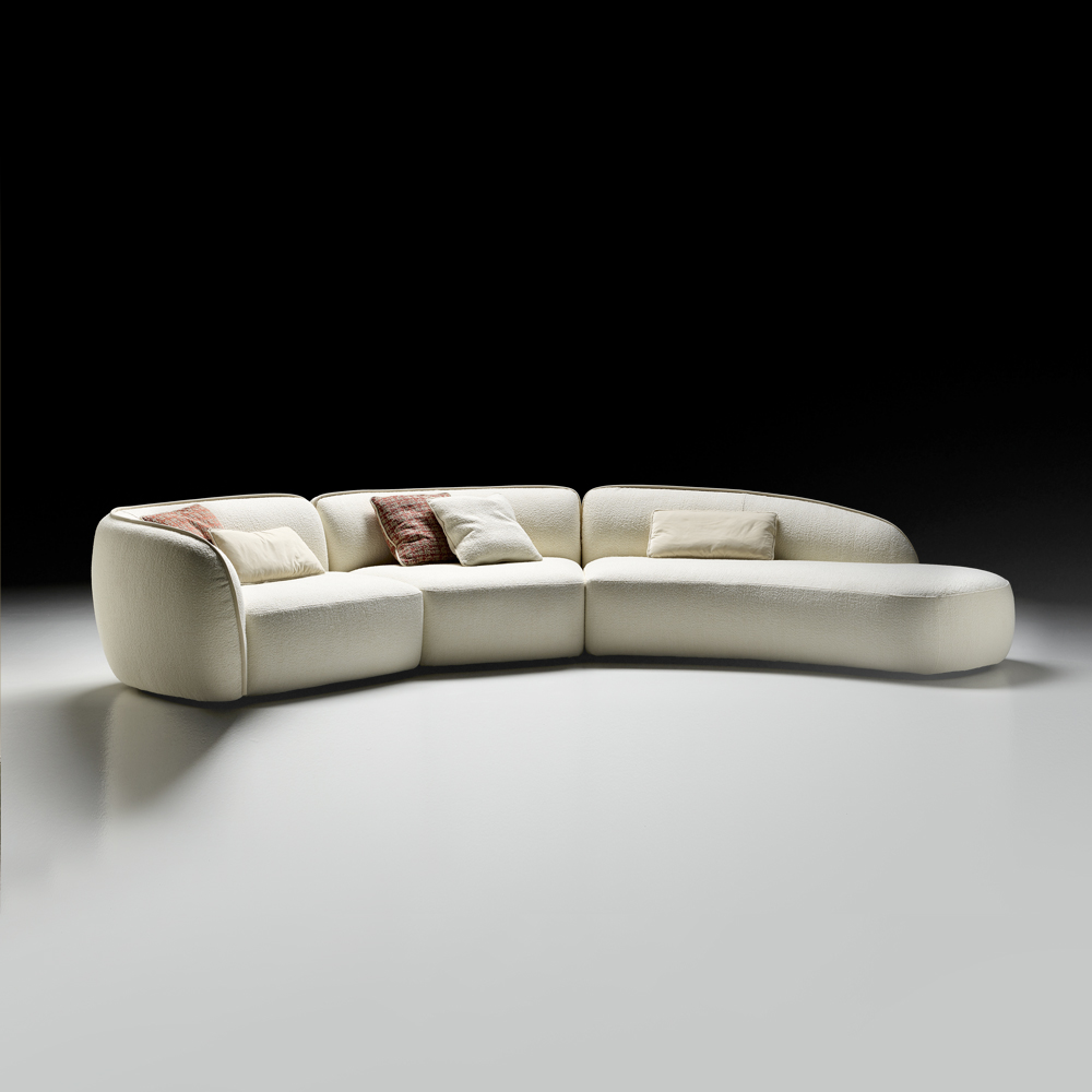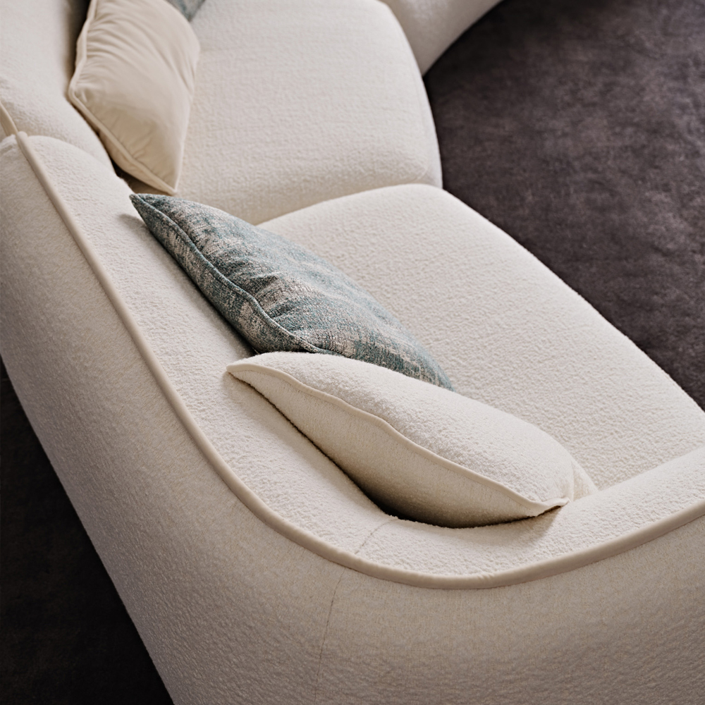Offering a spacious seating area and upholstered to the highest standard in a fine quality contemporary on trend ivory Bouclé fabric, with beautiful tonal piping detail. On hidden wooden feet. A solid poplar wooden structure, with a crossed elastic belt spring system. Padded in foam and memory foam in various different densities for the ultimate in luxurious comfort. Fully removable covers for complete ease and versatility. Seat height 41 cm. Please note that the scatter cushions are available, but not included in the price. Also available in the opposite orientation, and in various other modular combinations. Alternative fabrics including customers own also available by request. Prices will vary. The Luxury Round Bouclé Pouffe is also available.