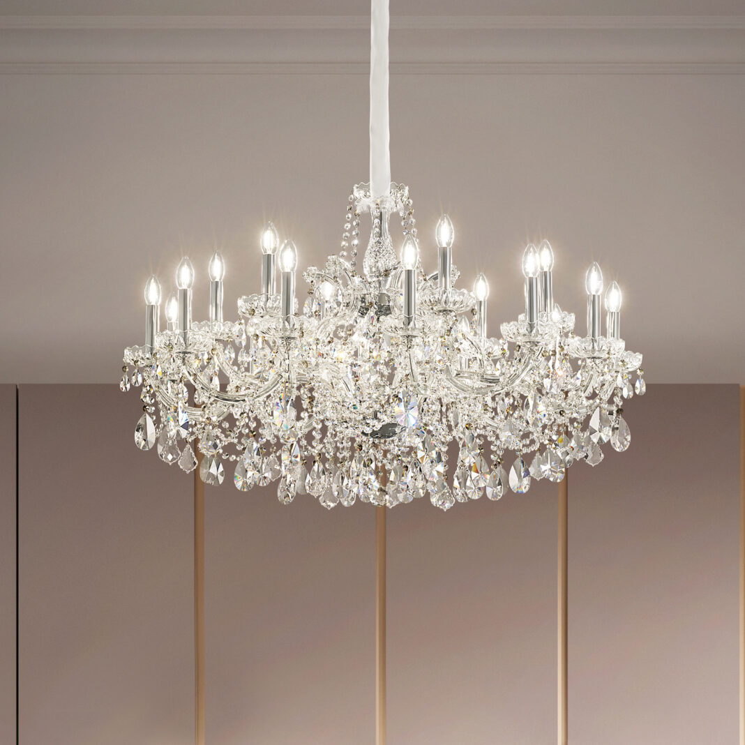 Its galvanised metal frame in a polished chrome finish with arms covered in clear glass, is adorned with dazzling crystals and bobèche. Transparent with a dash of smoked, in either half cut glass, cut crystal or premium crystal. Radiating a warm and inviting glow. Weight 23 kg. Requires 18 x E14 10 W MAX bulbs.