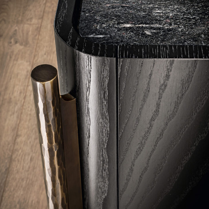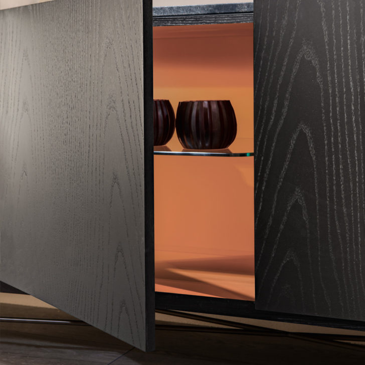 Sleek lines with rounded edges define the exquisite Black Ash wooden structure with a striking inset Brushed Black Cosmic Marble top. Boasting 4 doors, fitted with a soft-close mechanism for effortless closing. The raised door heights act as the handles, in line with the minimal look and feel. Wonderfully nestled on a vertical iron support structure with facets created by hand in a patinated bronze finish setting the tone of this stylish sideboard. Internally the space is divided by a polished-edge glass shelf and internal finish in a beautiful Moroccan earthy tone. Weight 220 kg. Creating a fabulous focus. Available with alternative finishes. Prices will vary.