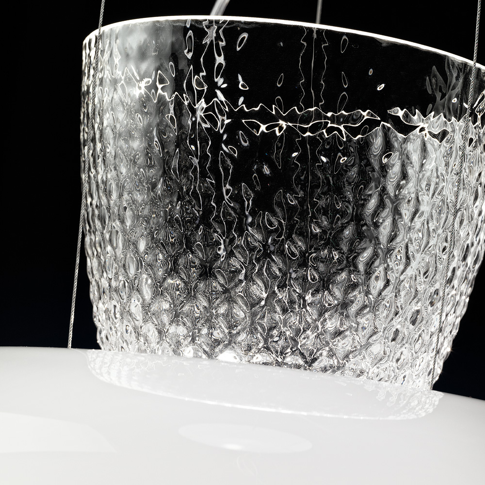 Featuring a sturdy central frame in a chrome finish, this pendant light boasts a dome shaped opaque white Murano glass shade topped by a textured clear glass top. Weight 15 kg. Transparent hanging cable included as standard – max total height 190 cm. Dimmable 2700K CRI90 LED bulb included. Available in alternative sizes and finishes by request. Prices will vary.