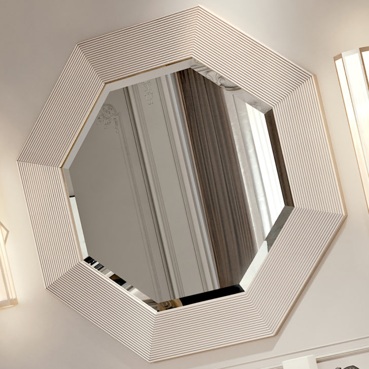 A natural glass bevelled mirror, complemented by a contrasting high gloss off white lacquered deco style ribbed frame. Height 130 cm x width 130 x depth 4 cm. Paired here together with the Luxury High End Modern Lacquered Dresser and pouffe, which is also available here at Juliettes Interiors. Alternative colours, finishes and customised sizes are available upon request. Prices will vary.